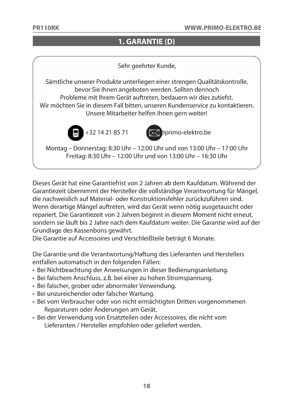 Sehr geehrter Kunde, Sämtliche unserer Produkte unterliegen einer strengen Qualitätskontrolle, bevor Sie Ihnen angeboten werden. Sollten dennoch Probleme mit Ihrem Gerät auftreten, bedauern wir dies zutiefst. Wir möchten Sie in diesem Fall bitten, unseren Kundenservice zu kontaktieren. Unsere Mitarbeiter helfen Ihnen gern weiter! +32 14 21 85 71 info@primo-elektro.be Montag – Donnerstag: 8:30 Uhr – 12:00 Uhr und von 13:00 Uhr – 17:00 Uhr Freitag: 8:30 Uhr – 12:00 Uhr und von 13:00 Uhr – 16:30 Uhr Dieses Gerät hat eine Garantiefrist von 2 Jahren ab dem Kaufdatum. Während der Garantiezeit übernimmt der Hersteller die vollständige Verantwortung für Mängel, die nachweislich auf Material- oder Konstruktionsfehler zurückzuführen sind. Wenn derartige Mängel auftreten, wird das Gerät wenn nötig ausgetauscht oder repariert. Die Garantiezeit von 2 Jahren beginnt in diesem Moment nicht erneut, sondern sie läuft bis 2 Jahre nach dem Kaufdatum weiter. Die Garantie wird auf der Grundlage des Kassenbons gewährt. Die Garantie auf Accessoires und Verschleißteile beträgt 6 Monate. Die Garantie und die Verantwortung/Haftung des Lieferanten und Herstellers entfallen automatisch in den folgenden Fällen: