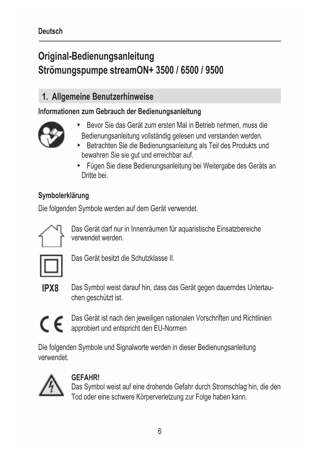 Informationen zum Gebrauch der Bedienungsanleitung ▶ Bevor Sie das Gerät zum ersten Mal in Betrieb nehmen, muss die Bedienungsanleitung vollständig gelesen und verstanden werden. ▶ Betrachten Sie die Bedienungsanleitung als Teil des Produkts und bewahren Sie sie gut und erreichbar auf. ▶ Fügen Sie diese Bedienungsanleitung bei Weitergabe des Geräts an Dritte bei. Symbolerklärung Die folgenden Symbole werden auf dem Gerät verwendet. Das Gerät darf nur in Innenräumen für aquaristische Einsatzbereiche verwendet werden. Das Gerät besitzt die Schutzklasse II. Das Symbol weist darauf hin, dass das Gerät gegen dauerndes Untertau- chen geschützt ist. Das Gerät ist nach den jeweiligen nationalen Vorschriften und Richtlinien approbiert und entspricht den EU-Normen Die folgenden Symbole und Signalworte werden in dieser Bedienungsanleitung verwendet. GEFAHR! Das Symbol weist auf eine drohende Gefahr durch Stromschlag hin, die den Tod oder eine schwere Körperverletzung zur Folge haben kann. IPX8Deutsch