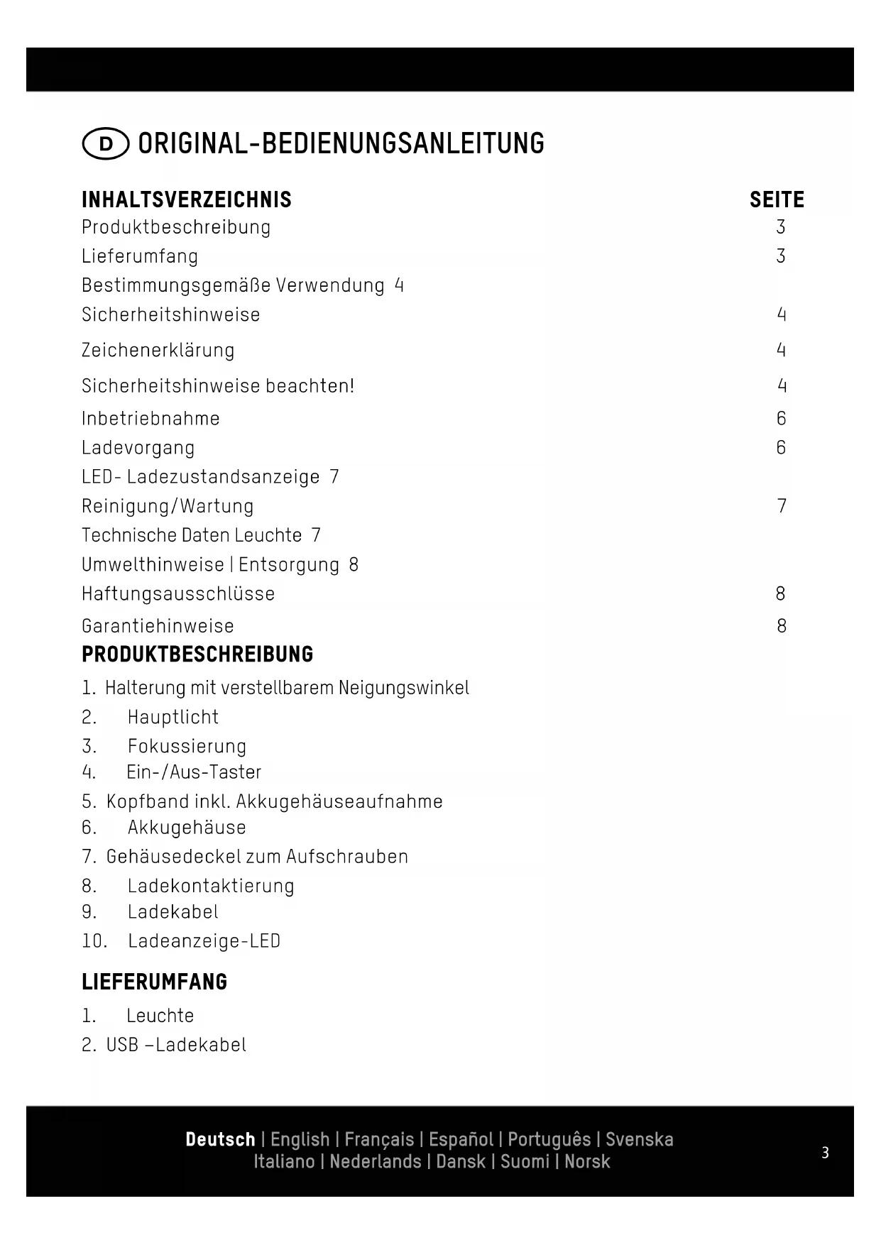 Produktbeschreibung 3 Lieferumfang 3 Bestimmungsgemäße Verwendung 4 Sicherheitshinweise 4 Zeichenerklärung 4 Sicherheitshinweise beachten! 4 Inbetriebnahme 6 Ladevorgang 6 LED- Ladezustandsanzeige 7 Reinigung/Wartung 7 Technische Daten Leuchte 7 Umwelthinweise | Entsorgung 8 Haftungsausschlüsse 8 Garantiehinweise 8 Deutsch | English | Français | Español | Português | Svenska Italiano | Nederlands | Dansk | Suomi | Norsk4