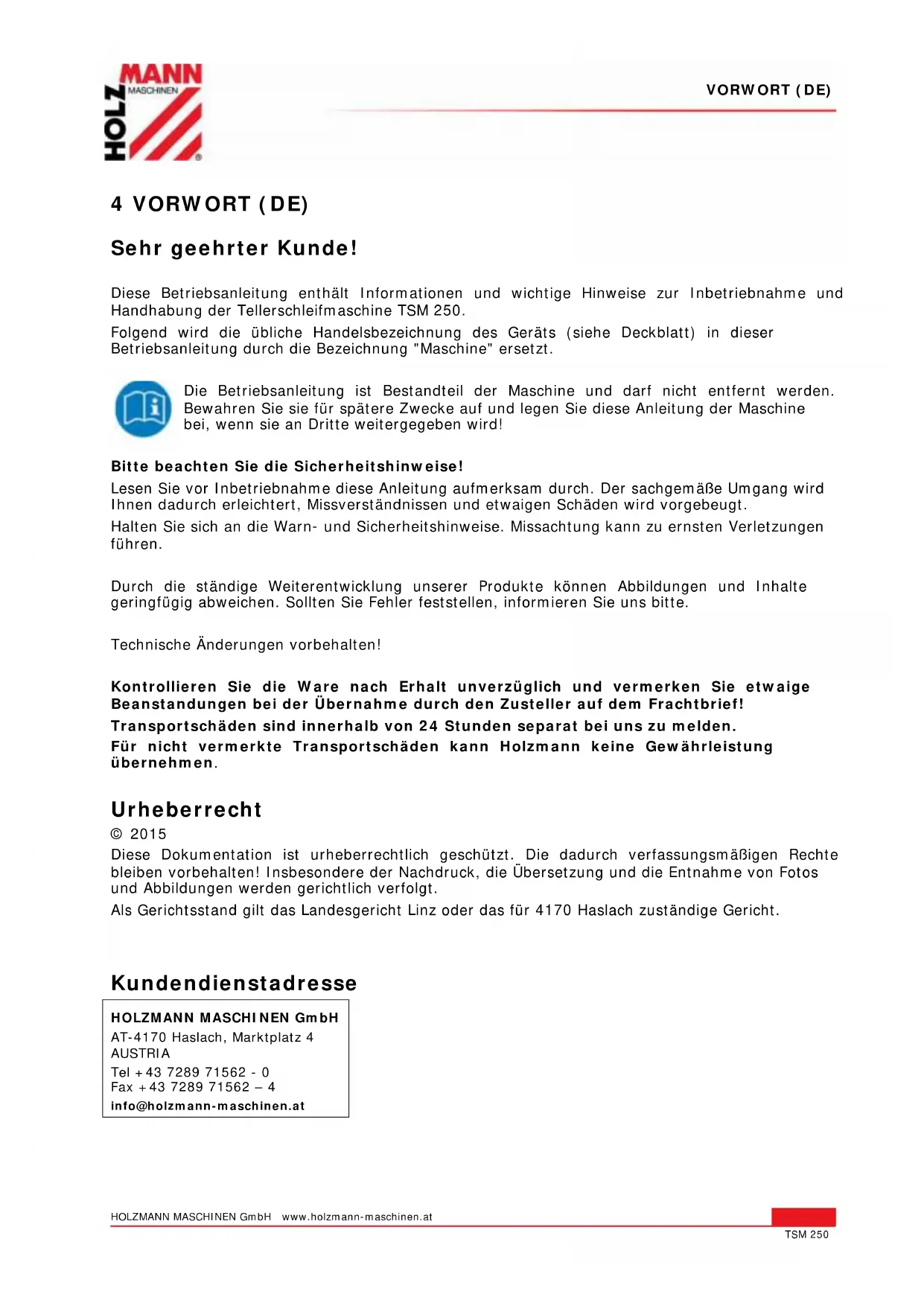 Schleifscheibe / Disque abrasif Ø 254 mm Absauganschluss / Buse d’aspiration Ø 35mm Tischgröße / Dimension de la table 290 x 140 mm Tischschwenkung / Inclinaison de la table ± 45° Maschinenmaße / Dimension de la machine 350 x 380 x 300mm Gewicht / Poids 11 kgVORWORT (DE) HOLZMANN MASCHINEN GmbH www.holzmann-maschinen.at 6 TSM 250 4 VORWORT (DE) Sehr geehrter Kunde! Diese Betriebsanleitung enthält Informationen und wichtige Hinweise zur Inbetriebnahme und Handhabung der Tellerschleifmaschine TSM 250. Folgend wird die übliche Handelsbezeichnung des Geräts (siehe Deckblatt) in dieser Betriebsanleitung durch die Bezeichnung "Maschine" ersetzt. Die Betriebsanleitung ist Bestandteil der Maschine und darf nicht entfernt werden. Bewahren Sie sie für spätere Zwecke auf und legen Sie diese Anleitung der Maschine bei, wenn sie an Dritte weitergegeben wird! Bitte beachten Sie die Sicherheitshinweise! Lesen Sie vor Inbetriebnahme diese Anleitung aufmerksam durch. Der sachgemäße Umgang wird Ihnen dadurch erleichtert, Missverständnissen und etwaigen Schäden wird vorgebeugt. Halten Sie sich an die Warn- und Sicherheitshinweise. Missachtung kann zu ernsten Verletzungen führen. Durch die ständige Weiterentwicklung unserer Produkte können Abbildungen und Inhalte geringfügig abweichen. Sollten Sie Fehler feststellen, informieren Sie uns bitte. Technische Änderungen vorbehalten! Kontrollieren Sie die Ware nach Erhalt unverzüglich und vermerken Sie etwaige Beanstandungen bei der Übernahme durch den Zusteller auf dem Frachtbrief! Transportschäden sind innerhalb von 24 Stunden separat bei uns zu melden. Für nicht vermerkte Transportschäden kann Holzmann keine Gewährleistung übernehmen. Urheberrecht © 2015 Diese Dokumentation ist urheberrechtlich geschützt. Die dadurch verfassungsmäßigen Rechte bleiben vorbehalten! Insbesondere der Nachdruck, die Übersetzung und die Entnahme von Fotos und Abbildungen werden gerichtlich verfolgt. Als Gerichtsstand gilt das Landesgericht Linz oder das für 4170 Haslach zuständige Gericht. Kundendienstadresse HOLZMANN MASCHINEN GmbH AT-4170 Haslach, Marktplatz 4 AUSTRIA Tel +43 7289 71562 - 0 Fax +43 7289 71562 – 4 info@holzmann-maschinen.atSICHERHEIT HOLZMANN MASCHINEN GmbH www.holzmann-maschinen.at 7 TSM 250 5 SICHERHEIT