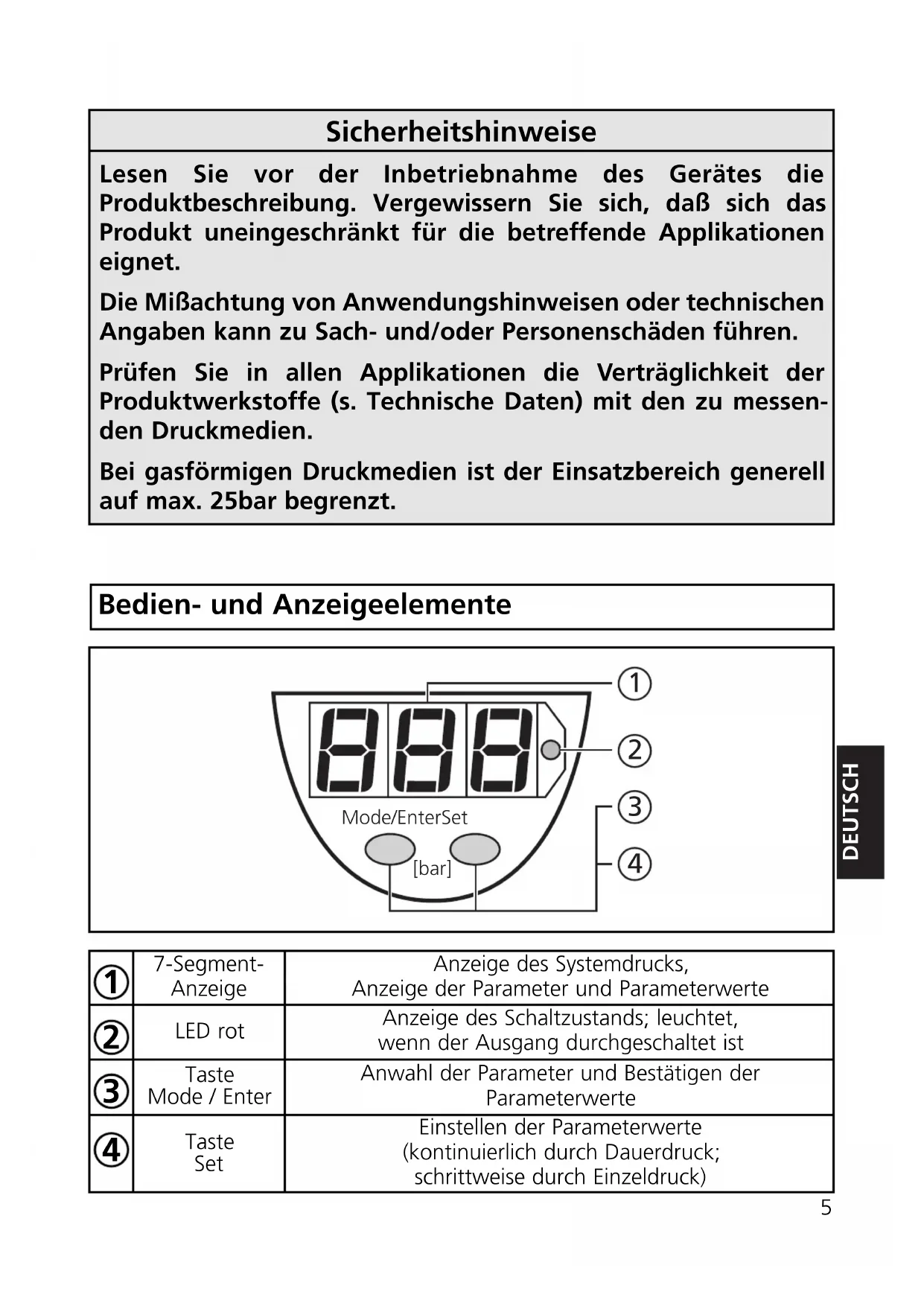 Bedien- und Anzeigeelemente 7-Segment- Anzeige Anzeige des Systemdrucks, Anzeige der Parameter und Parameterwerte LED rot Anzeige des Schaltzustands; leuchtet, wenn der Ausgang durchgeschaltet ist Taste Mode / Enter Anwahl der Parameter und Bestätigen der Parameterwerte Taste Set Einstellen der Parameterwerte (kontinuierlich durch Dauerdruck; schrittweise durch Einzeldruck)
