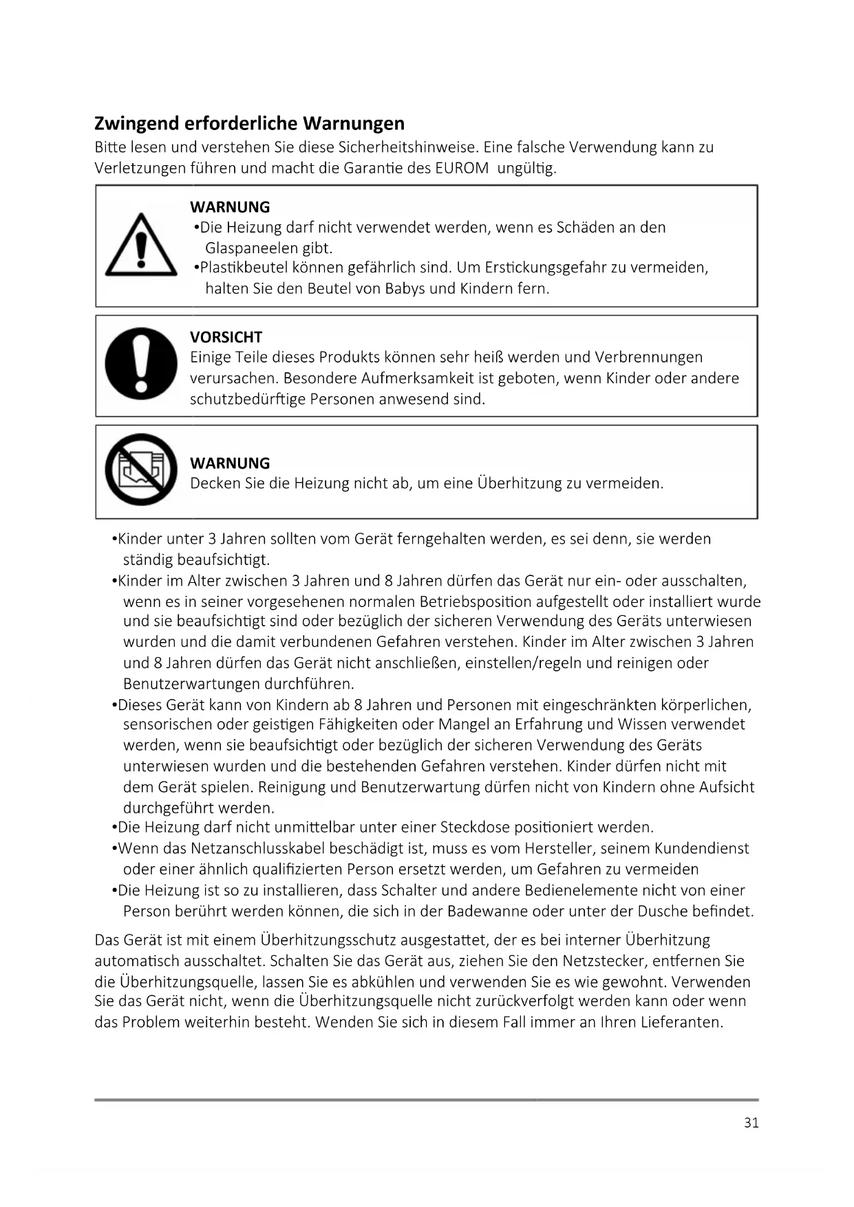 - Die Heizung darf nicht verwendet werden, wenn es Schäden an den Glaspaneelen gibt.