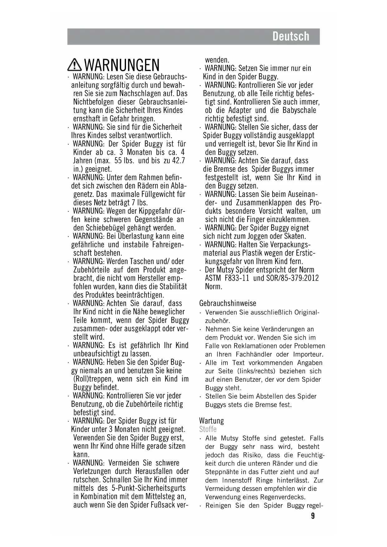 - Der Mutsy Spider entspricht der Norm ASTM F833-11 und SOR/85-379:2012 Norm. Gebrauchshinweise