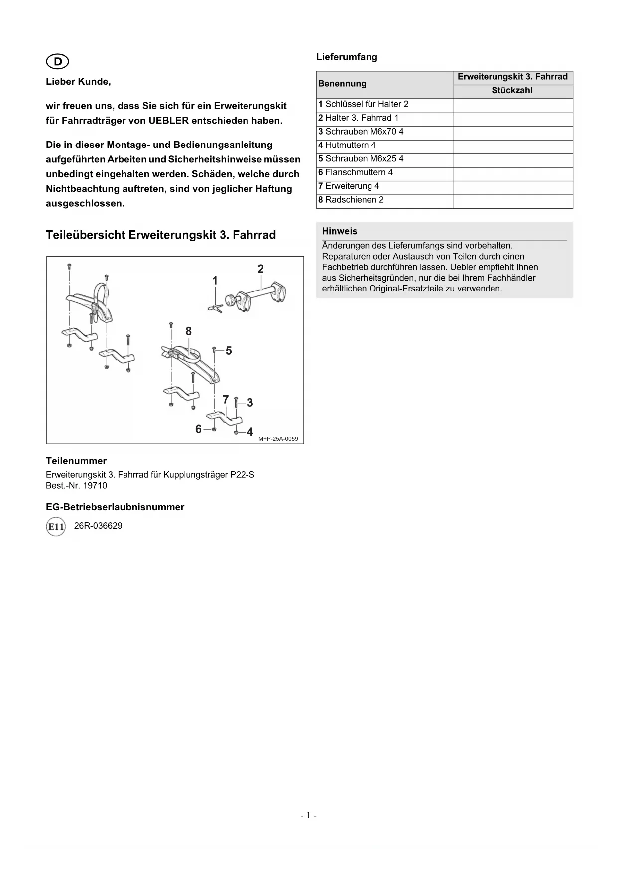 Lieber Kunde, wir freuen uns, dass Sie sich für ein Erweiterungskit für Fahrradträger von UEBLER entschieden haben. Die in dieser Montage- und Bedienungsanleitung aufgeführten Arbeiten und Sicherheitshinweise müssen unbedingt eingehalten werden. Schäden, welche durch Nichtbeachtung auftreten, sind von jeglicher Haftung ausgeschlossen. Teileübersicht Erweiterungskit 3. Fahrrad Teilenummer Erweiterungskit 3. Fahrrad für Kupplungsträger P22-S Best.-Nr. 19710 EG-Betriebserlaubnisnummer 26R-036629 Lieferumfang