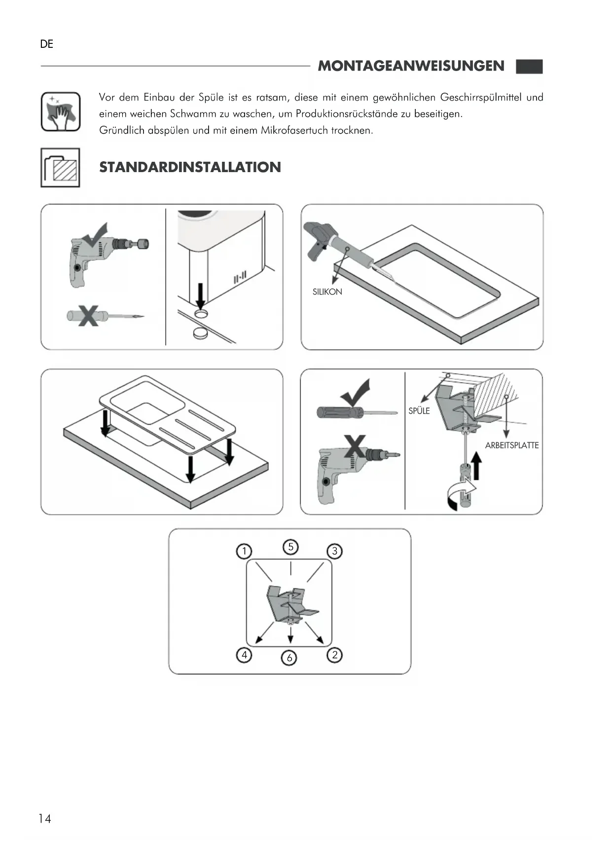 MONTAGEANWEISUNGEN Vor dem Einbau der Spüle ist es ratsam, diese mit einem gewöhnlichen Geschirrspülmittel und einem weichen Schwamm zu waschen, um Produktionsrückstände zu beseitigen. Gründlich abspülen und mit einem Mikrofasertuch trocknen. STANDARDINSTALLATION SPÜLE ARBEITSPLATTE SILIKON15