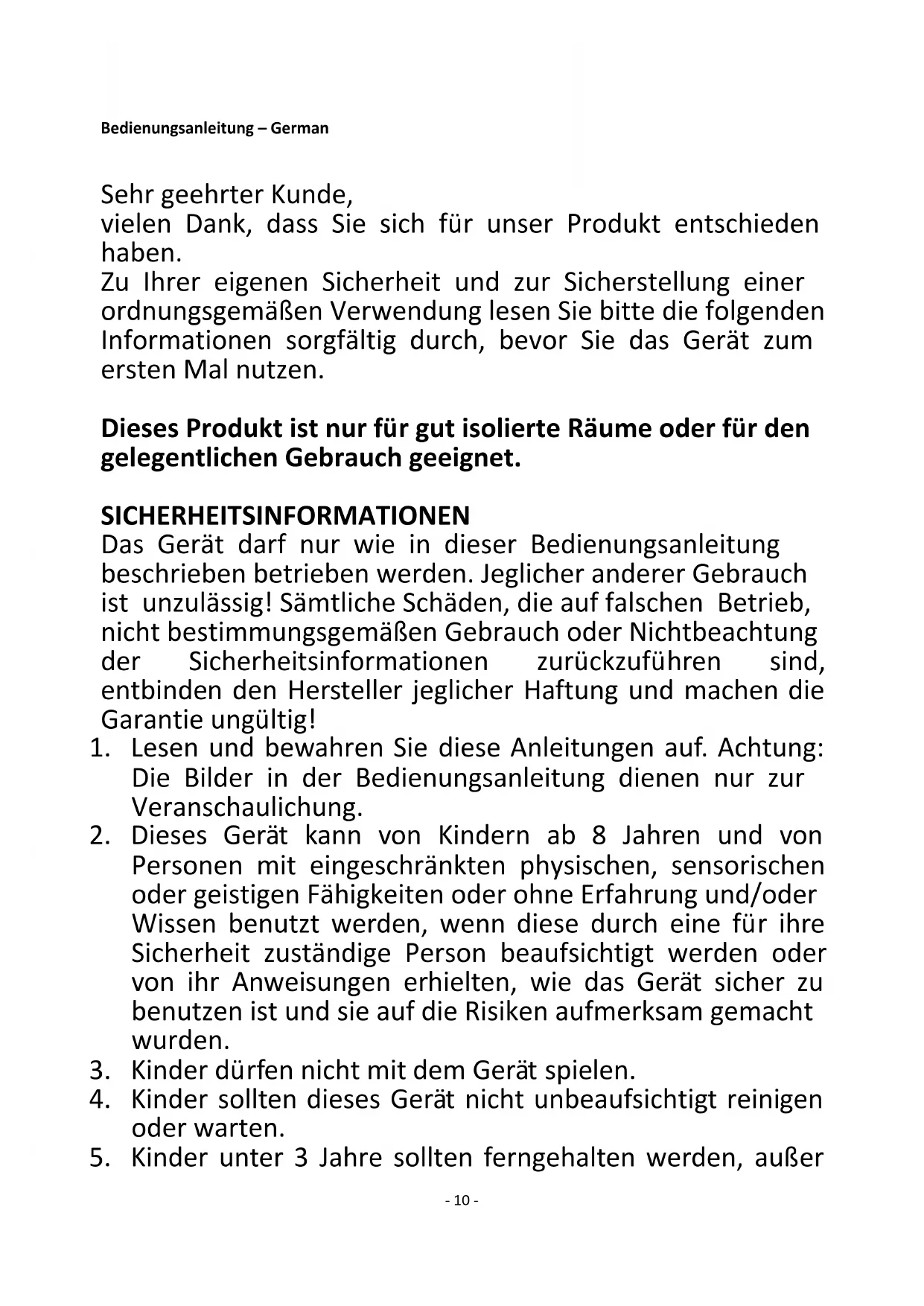 Satisfies the requirement of the Council Directives: COMMISSION REGULATION (EU) No 2015/1188 of 28 April 2015 and Amending COMMISSION REGULATION (EU) 2016/2282 implementing Directive 2009/125/EC of the European Parliament and of the Council with regard to ecodesign requirements for local space heaters Regarding information for consumers on how to install, use and maintain the product, WEEE information, please check the instruction manual provided with packaging.- 10 - Bedienungsanleitung – German Sehr geehrter Kunde, vielen Dank, dass Sie sich für unser Produkt entschieden haben. Zu Ihrer eigenen Sicherheit und zur Sicherstellung einer ordnungsgemäßen Verwendung lesen Sie bitte die folgenden Informationen sorgfältig durch, bevor Sie das Gerät zum ersten Mal nutzen. Dieses Produkt ist nur für gut isolierte Räume oder für den gelegentlichen Gebrauch geeignet. SICHERHEITSINFORMATIONEN Das Gerät darf nur wie in dieser Bedienungsanleitung beschrieben betrieben werden. Jeglicher anderer Gebrauch ist unzulässig! Sämtliche Schäden, die auf falschen Betrieb, nicht bestimmungsgemäßen Gebrauch oder Nichtbeachtung der Sicherheitsinformationen zurückzuführen sind, entbinden den Hersteller jeglicher Haftung und machen die Garantie ungültig!