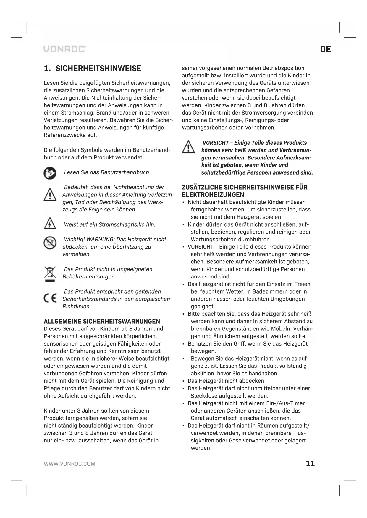 Lesen Sie die beigefügten Sicherheitswarnungen, die zusätzlichen Sicherheitswarnungen und die Anweisungen. Die Nichteinhaltung der Sicher- heitswarnungen und der Anweisungen kann in einem Stromschlag, Brand und/oder in schweren Verletzungen resultieren. Bewahren Sie die Sicher- heitswarnungen und Anweisungen für künftige Referenzzwecke auf. Die folgenden Symbole werden im Benutzerhand- buch oder auf dem Produkt verwendet: Lesen Sie das Benutzerhandbuch. Bedeutet, dass bei Nichtbeachtung der Anweisungen in dieser Anleitung Verletzun- gen, Tod oder Beschädigung des Werk- zeugs die Folge sein können. Weist auf ein Stromschlagrisiko hin. Wichtig! WARNUNG: Das Heizgerät nicht abdecken, um eine Überhitzung zu vermeiden. Das Produkt nicht in ungeeigneten Behältern entsorgen. Das Produkt entspricht den geltenden Sicherheitsstandards in den europäischen Richtlinien. ALLGEMEINE SICHERHEITSWARNUNGEN Dieses Gerät darf von Kindern ab 8Jahren und Personen mit eingeschränkten körperlichen, sensorischen oder geistigen Fähigkeiten oder fehlender Erfahrung und Kenntnissen benutzt werden, wenn sie in sicherer Weise beaufsichtigt oder eingewiesen wurden und die damit verbundenen Gefahren verstehen. Kinder dürfen nicht mit dem Gerät spielen. Die Reinigung und Pflege durch den Benutzer darf von Kindern nicht ohne Aufsicht durchgeführt werden. Kinder unter 3Jahren sollten von diesem Produkt ferngehalten werden, sofern sie nicht ständig beaufsichtigt werden. Kinder zwischen 3 und 8Jahren dürfen das Gerät nur ein- bzw. ausschalten, wenn das Gerät in seiner vorgesehenen normalen Betriebsposition aufgestellt bzw. installiert wurde und die Kinder in der sicheren Verwendung des Geräts unterwiesen wurden und die entsprechenden Gefahren verstehen oder wenn sie dabei beaufsichtigt werden. Kinder zwischen 3 und 8 Jahren dürfen das Gerät nicht mit der Stromversorgung verbinden und keine Einstellungs-, Reinigungs- oder Wartungsarbeiten daran vornehmen. VORSICHT – Einige Teile dieses Produkts können sehr heiß werden und Verbrennun- gen verursachen. Besondere Aufmerksam- keit ist geboten, wenn Kinder und schutzbedürftige Personen anwesend sind.