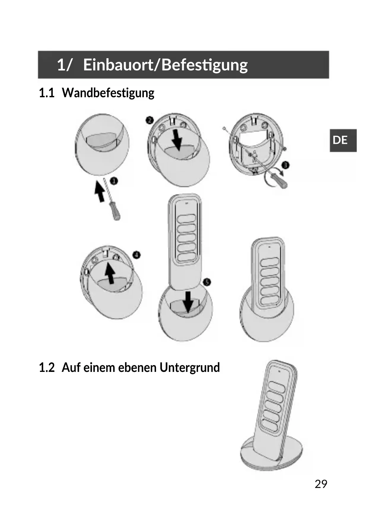1/ Einbauort/Befesgung 1.1 Wandbefestigung 1.2 Auf einem ebenen Untergrund30 2/ Funkzuordnung Wenn Sie einen Solarmotor besitzen, lesen Sie bie die entsprechende Bedienungsanleitung. 2.1 Verein eines DELTA DORE Funkmotors auf individuelle Bestellung Beim Einschalten der Stromversorgung macht sich ein Motor, der noch nicht per Funk gekoppelt wurde, immer durch eine kurze Bewegung bemerkbar. Er ist 10 Minuten lang kopplungsbereit.