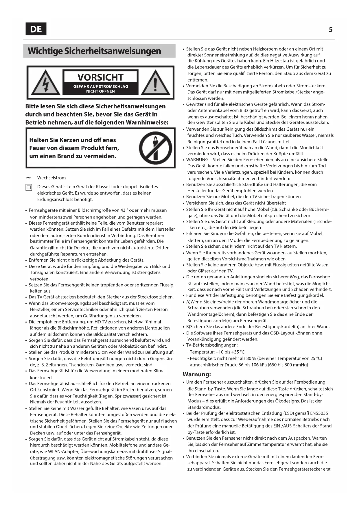 - Die unten genannten Anleitungen sind ein sicherer Weg, das Fernsehge- rät aufzustellen, indem man es an der Wand befestigt, was die Möglich- keit, dass es nach vorne Fällt und Verletzungen und Schäden verhindert.