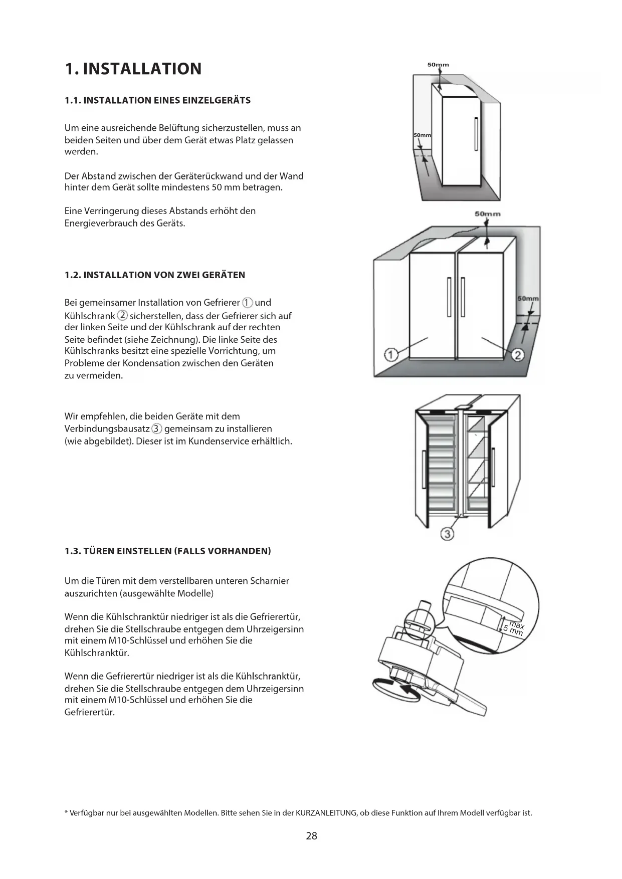 gemeinsam zu installieren (wieabgebildet). Dieser ist im Kundenservice erhältlich. 1.3. TÜREN EINSTELLEN (FALLS VORHANDEN) Um die Türen mit dem verstellbaren unteren Scharnier auszurichten (ausgewählte Modelle) Wenn die Kühlschranktür niedriger ist als die Gefrierertür, drehen Sie die Stellschraube entgegen dem Uhrzeigersinn mit einem M10-Schlüssel und erhöhen Sie die Kühlschranktür. Wenn die Gefrierertür niedriger ist als die Kühlschranktür, drehen Sie die Stellschraube entgegen dem Uhrzeigersinn mit einem M10-Schlüssel und erhöhen Sie die Gefrierertür.