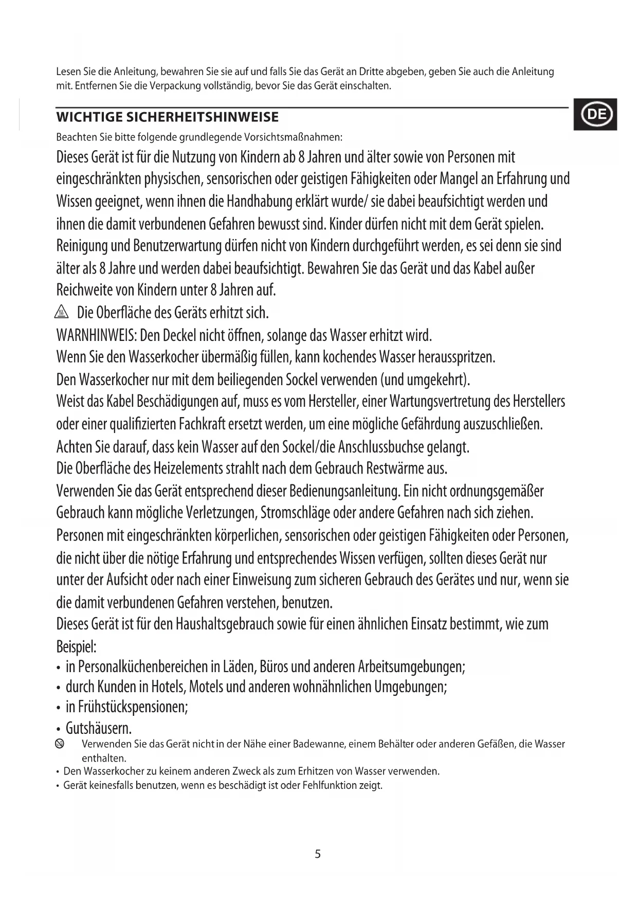 - Den Wasserkocher zu keinem anderen Zweck als zum Erhitzen von Wasser verwenden.