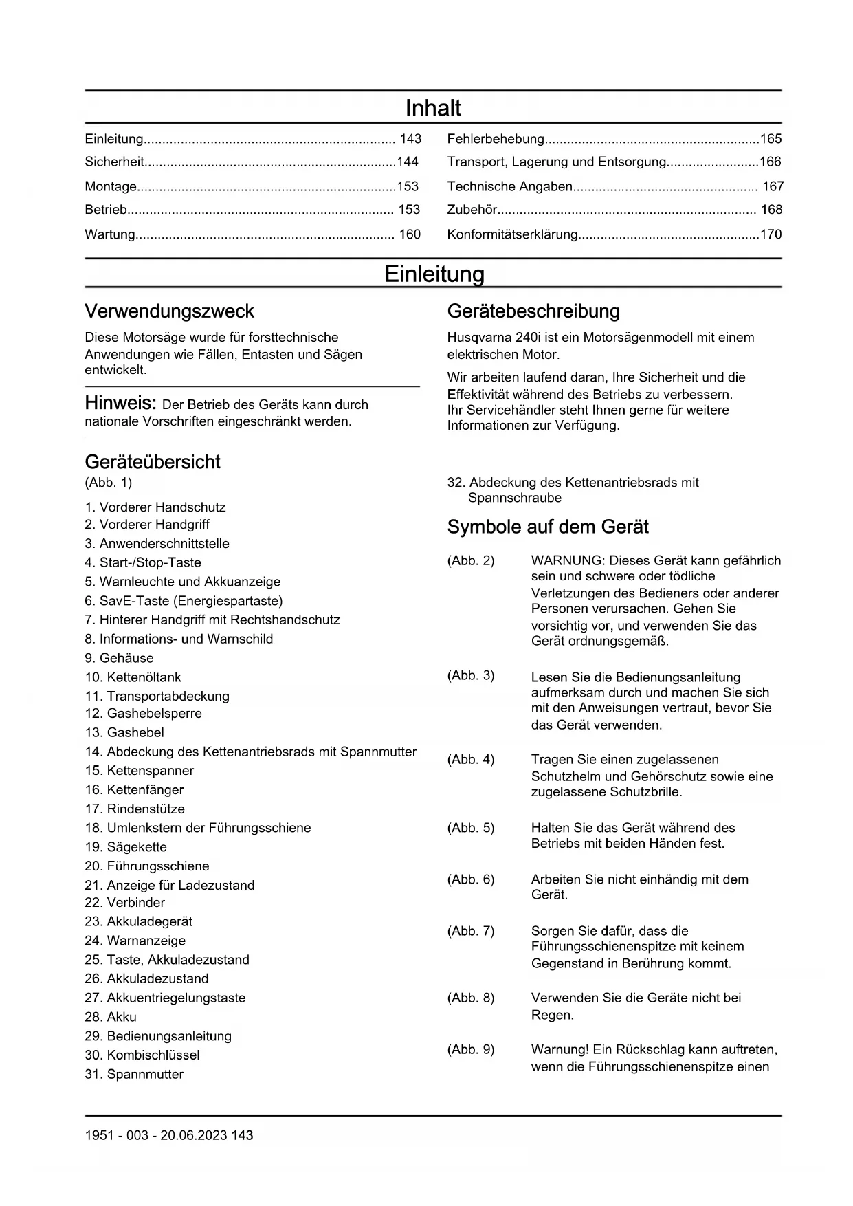- Konformitätserklärung Einleitung Verwendungszweck Diese Motorsäge wurde für forsttechnische Anwendungen wie Fällen, Entasten und Sägen entwickelt. Hinweis: Der Betrieb des Geräts kann durch nationale Vorschriften eingeschränkt werden. Gerätebeschreibung Husqvarna 240i ist ein Motorsägenmodell mit einem elektrischen Motor. Wir arbeiten laufend daran, Ihre Sicherheit und die Effektivität während des Betriebs zu verbessern. Ihr Servicehändler steht Ihnen gerne für weitere Informationen zur Verfügung. Geräteübersicht (Abb. 1) p. 170
