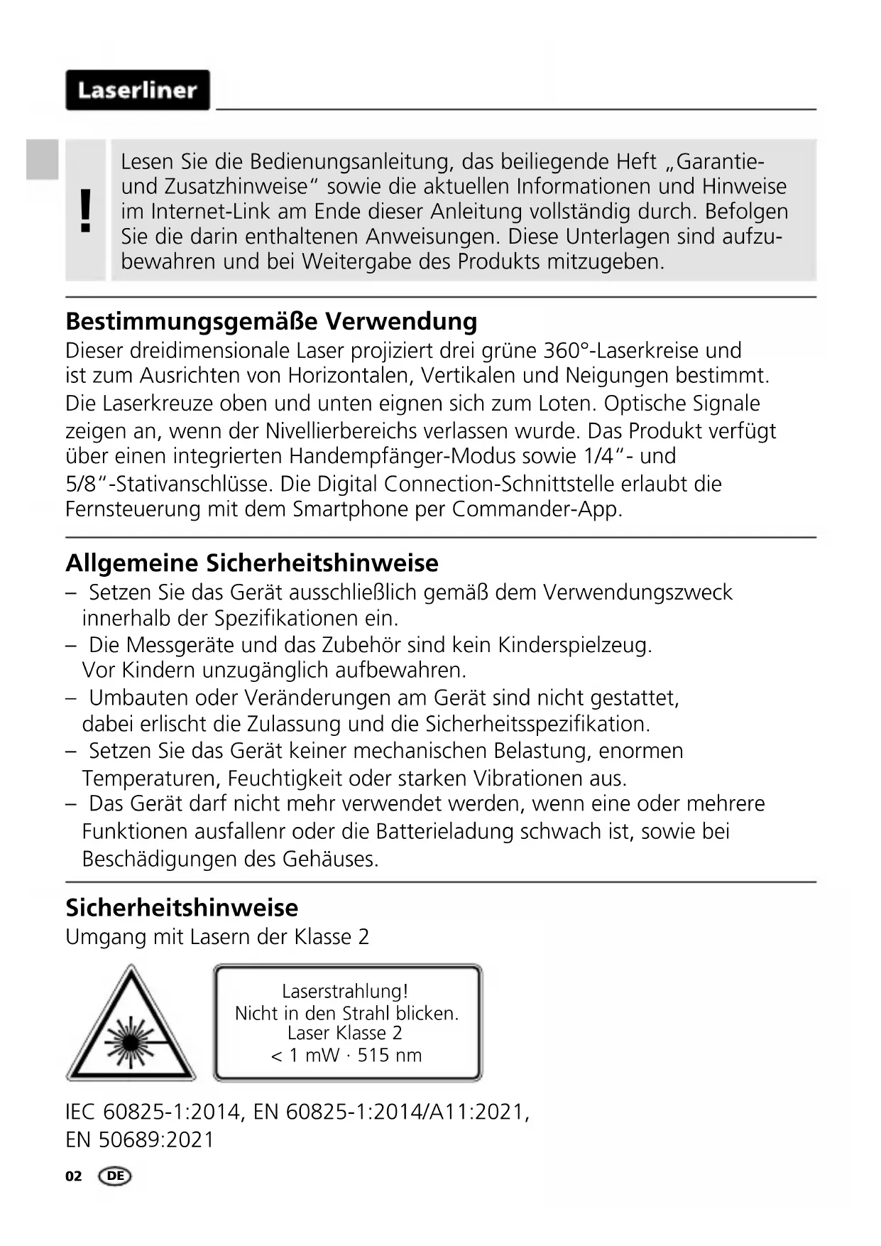 Bestimmungsgemäße Verwendung Dieser dreidimensionale Laser projiziert drei grüne 360°-Laserkreise und ist zum Ausrichten von Horizontalen, Vertikalen und Neigungen bestimmt. Die Laserkreuze oben und unten eignen sich zum Loten. Optische Signale zeigen an, wenn der Nivellierbereichs verlassen wurde. Das Produkt verfügt über einen integrierten Handempfänger-Modus sowie 1/4“- und 5/8“-Stativanschlüsse. Die Digital Connection-Schnittstelle erlaubt die Fernsteuerung mit dem Smartphone per Commander-App. Allgemeine Sicherheitshinweise – Setzen Sie das Gerät ausschließlich gemäß dem Verwendungszweck innerhalb der Spezikationen ein. – Die Messgeräte und das Zubehör sind kein Kinderspielzeug. Vor Kindern unzugänglich aufbewahren. – Umbauten oder Veränderungen am Gerät sind nicht gestattet, dabei erlischt die Zulassung und die Sicherheitsspezikation. – Setzen Sie das Gerät keiner mechanischen Belastung, enormen Temperaturen, Feuchtigkeit oder starken Vibrationen aus. – Das Gerät darf nicht mehr verwendet werden, wenn eine oder mehrere Funktionen ausfallenr oder die Batterieladung schwach ist, sowie bei Beschädigungen des Gehäuses. Sicherheitshinweise Umgang mit Lasern der Klasse 2 Laserstrahlung! Nicht in den Strahl blicken. Laser Klasse 2 < 1 mW · 515 nm IEC 60825-1:2014, EN 60825-1:2014/A11:2021, EN 50689:2021CompactPlane-Laser 3G