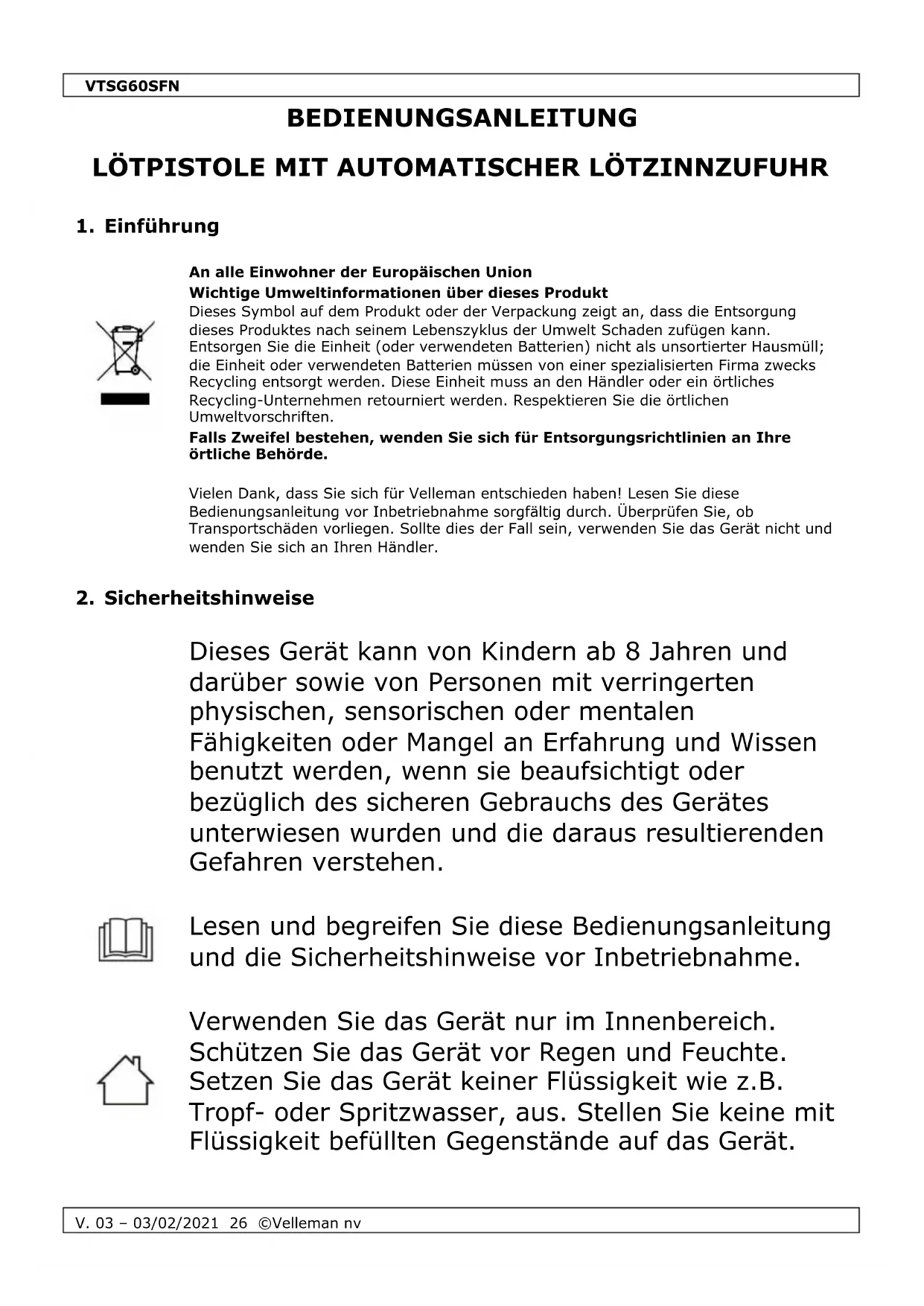 Verwenden Sie dieses Gerät nur mit originellen Zubehörteilen. Velleman NV übernimmt keine Haftung für Schaden oder Verletzungen bei (falscher) Anwendung dieses Gerätes. Mehr Informationen zu diesem Produkt und die neueste Version dieser Bedienungsanleitung finden Sie hier: www.velleman.eu. Alle Änderungen ohne vorherige Ankündigung vorbehalten. © URHEBERRECHT Velleman NV besitzt das Urheberrecht für diese Bedienungsanleitung. Alle weltweiten Rechte vorbehalten. Ohne vorherige schriftliche Genehmigung des Urhebers ist es nicht gestattet, diese Bedienungsanleitung ganz oder in Teilen zu reproduzieren, zu kopieren, zu übersetzen, zu bearbeiten oder zu speichern.VTSG60SFN