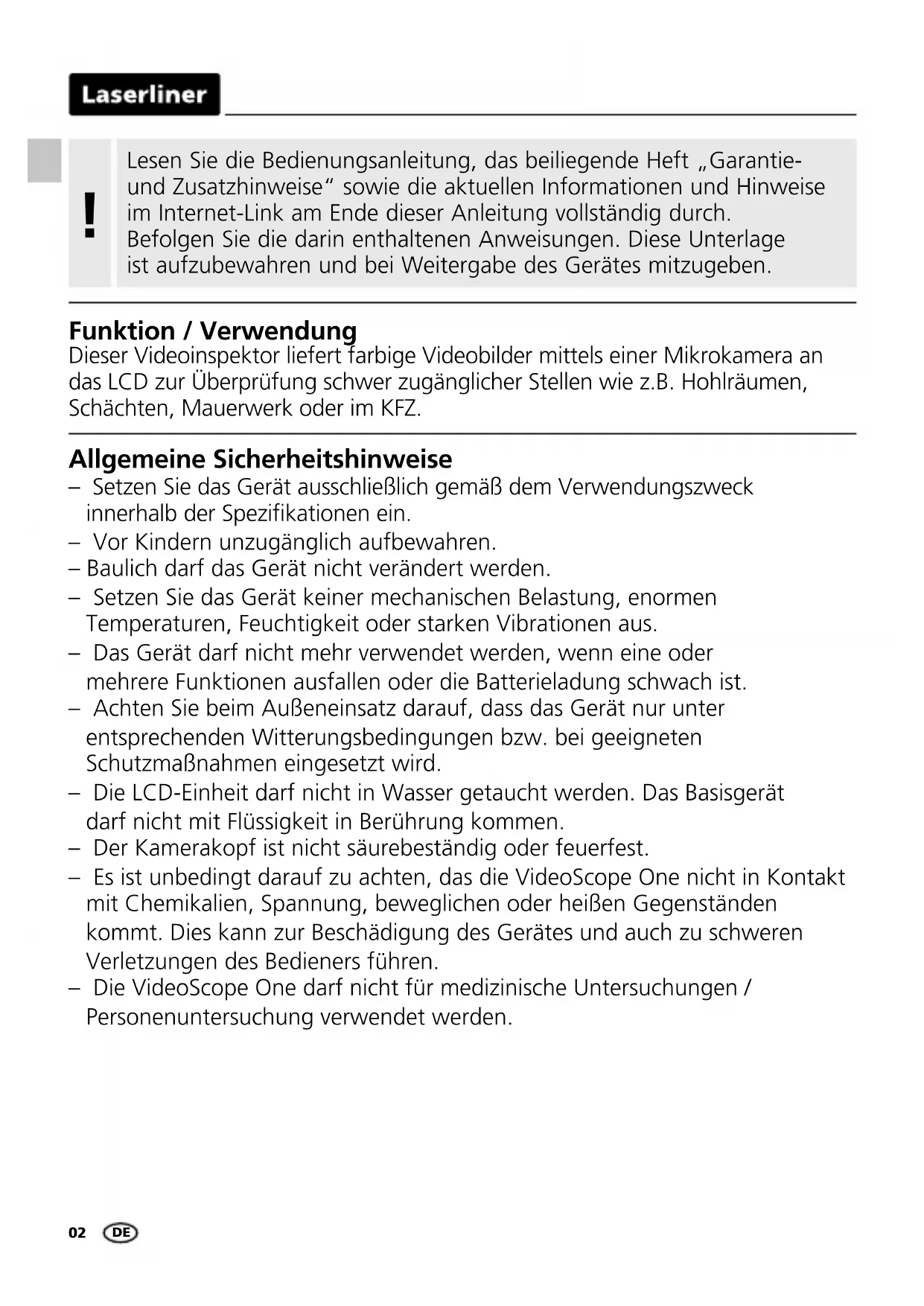 Funktion / Verwendung Dieser Videoinspektor liefert farbige Videobilder mittels einer Mikrokamera an das LCD zur Überprüfung schwer zugänglicher Stellen wie z.B. Hohlräumen, Schächten, Mauerwerk oder im KFZ. Allgemeine Sicherheitshinweise – Setzen Sie das Gerät ausschließlich gemäß dem Verwendungszweck innerhalb der Spezikationen ein. – Vor Kindern unzugänglich aufbewahren. – Baulich darf das Gerät nicht verändert werden. – Setzen Sie das Gerät keiner mechanischen Belastung, enormen Temperaturen, Feuchtigkeit oder starken Vibrationen aus. – Das Gerät darf nicht mehr verwendet werden, wenn eine oder mehrere Funktionen ausfallen oder die Batterieladung schwach ist. – Achten Sie beim Außeneinsatz darauf, dass das Gerät nur unter entsprechenden Witterungsbedingungen bzw. bei geeigneten Schutzmaßnahmen eingesetzt wird. – Die LCD-Einheit darf nicht in Wasser getaucht werden. Das Basisgerät darf nicht mit Flüssigkeit in Berührung kommen. – Der Kamerakopf ist nicht säurebeständig oder feuerfest. – Es ist unbedingt darauf zu achten, das die VideoScope One nicht in Kontakt mit Chemikalien, Spannung, beweglichen oder heißen Gegenständen kommt. Dies kann zur Beschädigung des Gerätes und auch zu schweren Verletzungen des Bedieners führen. – Die VideoScope One darf nicht für medizinische Untersuchungen / Personenuntersuchung verwendet werden. Lesen Sie die Bedienungsanleitung, das beiliegende Heft „Garantie- und Zusatzhinweise“ sowie die aktuellen Informationen und Hinweise im Internet-Link am Ende dieser Anleitung vollständig durch. Befolgen Sie die darin enthaltenen Anweisungen. Diese Unterlage ist aufzubewahren und bei Weitergabe des Gerätes mitzugeben. !VideoScope One