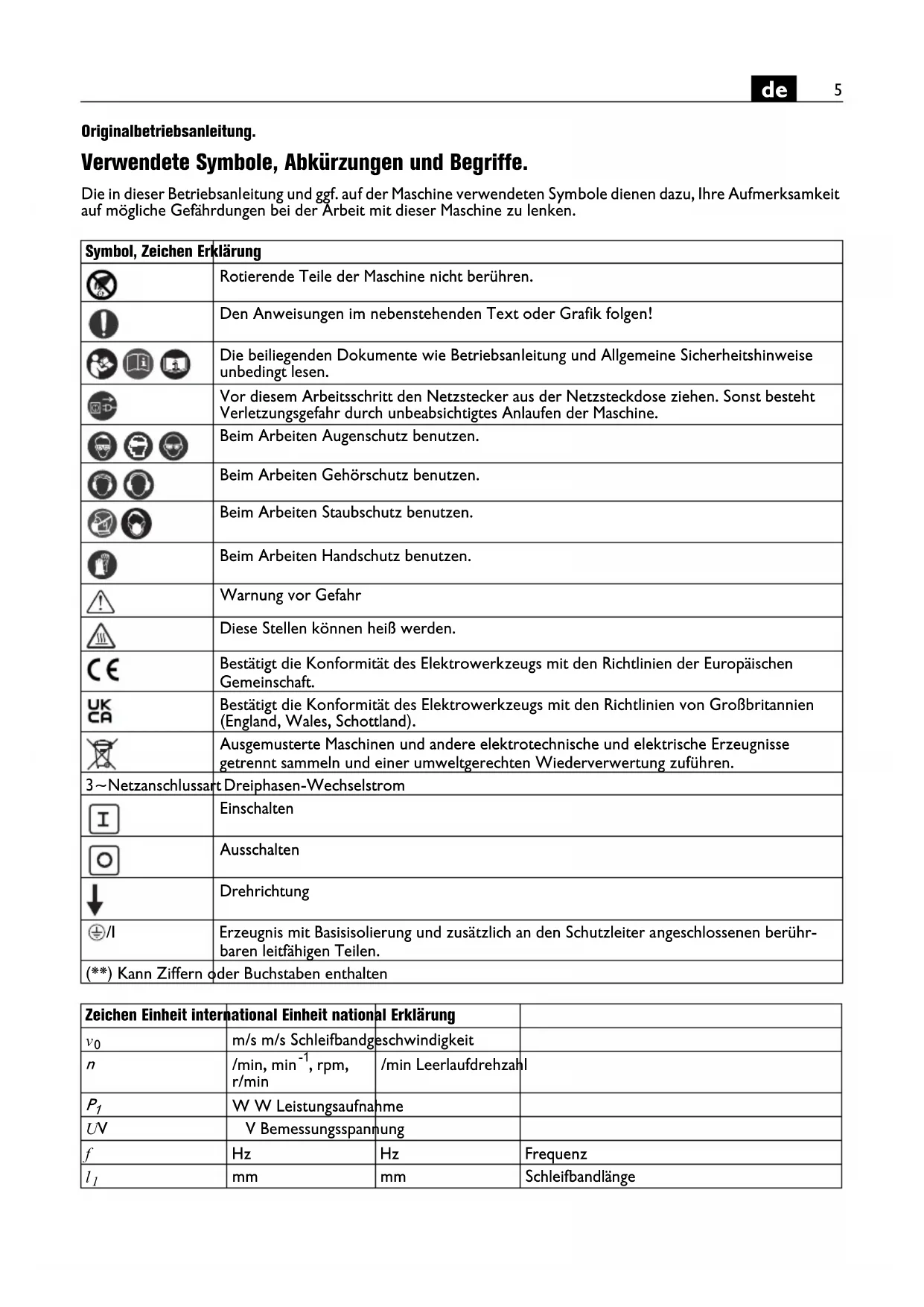 Originalbetriebsanleitung.Übersetzung der Originalbetriebsanleitung. Verwendete Symbole, Abkürzungen und Begriffe. Die in dieser Betriebsanleitung und ggf. auf der Maschine verwendeten Symbole dienen dazu, Ihre Aufmerksamkeit auf mögliche Gefährdungen bei der Arbeit mit dieser Maschine zu lenken. Symbol, Zeichen Erklärung Rotierende Teile der Maschine nicht berühren. Den Anweisungen im nebenstehenden Text oder Grafik folgen! Die beiliegenden Dokumente wie Betriebsanleitung und Allgemeine Sicherheitshinweise unbedingt lesen. Vor diesem Arbeitsschritt den Netzstecker aus der Netzsteckdose ziehen. Sonst besteht Verletzungsgefahr durch unbeabsichtigtes Anlaufen der Maschine. Beim Arbeiten Augenschutz benutzen. Beim Arbeiten Gehörschutz benutzen. Beim Arbeiten Staubschutz benutzen. Beim Arbeiten Handschutz benutzen. Warnung vor Gefahr Diese Stellen können heiß werden. Bestätigt die Konformität des Elektrowerkzeugs mit den Richtlinien der Europäischen Gemeinschaft. Bestätigt die Konformität des Elektrowerkzeugs mit den Richtlinien von Großbritannien (England, Wales, Schottland). Ausgemusterte Maschinen und andere elektrotechnische und elektrische Erzeugnisse getrennt sammeln und einer umweltgerechten Wiederverwertung zuführen. 3 ~ Netzanschlussart Dreiphasen-Wechselstrom Einschalten Ausschalten Drehrichtung /I Erzeugnis mit Basisisolierung und zusätzlich an den Schutzleiter angeschlossenen berühr- baren leitfähigen Teilen. (**) Kann Ziffern oder Buchstaben enthalten Zeichen Einheit international Einheit national Erklärung