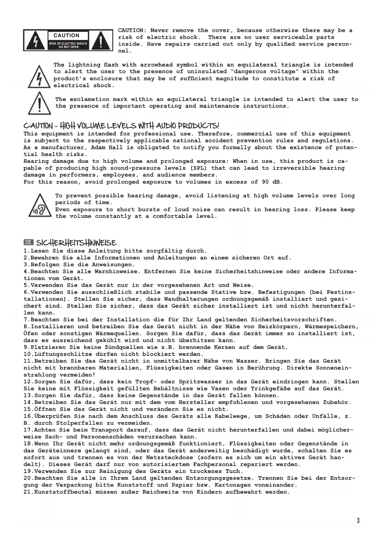 ACHTUNG Entfernen Sie niemals die Abdeckung, da sonst das Risiko eines ele- ktrischen Schlages besteht. Im Inneren des Geräts benden sich ke- ine Teile, die vom Bediener repariert oder gewartet werden können. Lassen Sie Reparaturen ausschließlich von qualiziertem Servicepersonal durchführen. Das gleichschenkelige Dreieck mit Blitzsymbol warnt vor nichtisolierten, gefährli- chen Spannungen im Geräteinneren, die einen elektrischen Schlag verursachen können. Das gleichschenkelige Dreieck mit Ausrufungszeichen kennzeichnet wichtige Bedien- ungs- und Wartungshinweise. ACHTUNG HOHE LAUTSTÄRKEN BEI AUDIOPRODUKTEN! Dieses Gerät ist für den professionellen Einsatz vorgesehen. Der kommerzielle Betrieb dieses Geräts unterliegt den jeweils gültigen nationalen Vorschriften und Richtlinien zur Unfallver- hütung. Als Hersteller ist Adam Hall gesetzlich verpichtet, Sie ausdrücklich auf mögliche Gesundheitsrisiken hinzuweisen. Gehörschäden durch hohe Lautstärken und Dauerbelastung: Bei der Verwendung dieses Produkts können hohe Schalldruckpegel (SPL) erzeugt werden, die bei Künstlern, Mitarbeitern und Zus- chauern zu irreparablen Gehörschäden führen können. Um eine mögliche Schädigung des Hörsinns zu verhindern, vermeiden Sie das Hören bei großem Lautsärkepegel über lange Zeiträume. Lauter Schalleinuss kann selbst bei kurzer Dauer zu Hörschäden führen. Bitte halten Sie die Laustärke immer auf einem angenehmen Level.