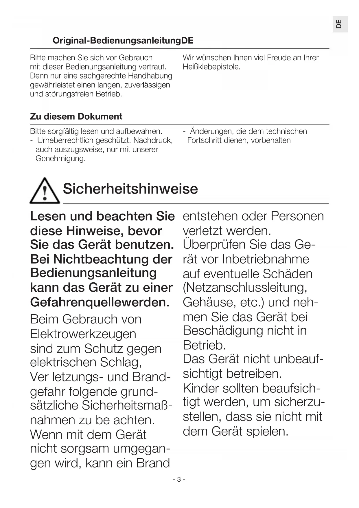 Lesen und beachten Sie diese Hinweise, bevor Sie das Gerät benutzen. Bei Nichtbeachtung der Be die nungsanleitung kann das Gerät zu einer Gefahren quelle werden. Beim Gebrauch von Elektrowerkzeugen sind zum Schutz gegen elektrischen Schlag, Ver letzungs- und Brand- gefahr folgende grund- sätzliche Sicherheitsmaß- nahmen zu be achten. Wenn mit dem Gerät nicht sorgsam umgegan- gen wird, kann ein Brand entstehen oder Personen verletzt werden. Überprüfen Sie das Ge- rät vor Inbetriebnahme auf eventuelle Schäden (Netzanschlussleitung, Gehäuse, etc.) und neh- men Sie das Gerät bei Beschädigung nicht in Betrieb. Das Gerät nicht unbeauf- sichtigt betreiben. Kinder sollten beaufsich- tigt werden, um sicherzu- stellen, dass sie nicht mit dem Gerät spielen. Bitte machen Sie sich vor Gebrauch mit dieser Bedienungsanleitung vertraut. Denn nur eine sachgerechte Handhabung gewährleistet einen langen, zuverlässigen und störungsfreien Betrieb. Wir wünschen Ihnen viel Freude an Ihrer Heißklebepistole. Original-BedienungsanleitungDE Zu diesem Dokument Bitte sorgfältig lesen und aufbewahren. - Urheberrechtlich geschützt. Nachdruck, auch auszugsweise, nur mit unserer Genehmigung. - Änderungen, die dem technischen Fortschritt dienen, vorbehalten Sicherheitshinweise- 4 - Berücksichtigen Sie Umgebungs- einflüsse. Setzen Sie Elektrowerk- zeuge nicht dem Regen aus. Benutzen Sie Elek- trowerkzeuge nicht im feuchten Zustand und nicht in feuchter oder nasser Umgebung. Vorsicht bei Gebrauch der Geräte in der Nähe brennbarer Materialien. Nicht für längere Zeit auf ein und dieselbe Stelle richten. Nicht bei Vor- handensein einer explo- sionsfähigen Atmosphäre verwenden. Austretende Wärme kann zu brenn- baren Materialien geleitet werden, die verdeckt sind. Schützen Sie sich vor elektrischem Schlag. Vermeiden Sie Körper- berühr ung mit geerdeten Teilen, zum Beispiel Roh- ren, Heizkörpern, Herden, Kühlschränken. Das Gerät nicht unbeauf- sichtigt lassen, so lange es in Betrieb ist. Bewahren Sie Ihre Werkzeuge sicher auf. Gerät nach Gebrauch auf Standfläche auflegen und abkühlen lassen, be vor es weggepackt wird. Unbenutzte Werkzeuge müssen im trockenen, verschlossenen Raum und für Kinder nicht erreichbar aufbewahrt werden. Dieses Gerät kann von Kindern ab 8 Jahren Sicherheitshinweise- 5 -
