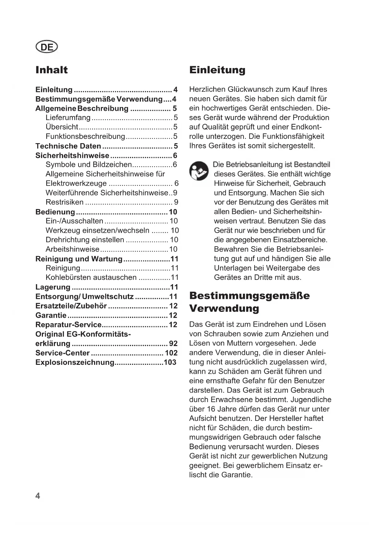 - Einleitung Herzlichen Glückwunsch zum Kauf Ihres neuen Gerätes. Sie haben sich damit für ein hochwertiges Gerät entschieden. Die- ses Gerät wurde während der Produktion auf Qualität geprüft und einer Endkont- rolle unterzogen. Die Funktionsfähigkeit Ihres Gerätes ist somit sichergestellt. Die Betriebsanleitung ist Bestandteil dieses Gerätes. Sie enthält wichtige Hinweise für Sicherheit, Gebrauch und Entsorgung. Machen Sie sich vor der Benutzung des Gerätes mit allen Bedien- und Sicherheitshin- weisen vertraut. Benutzen Sie das Gerät nur wie beschrieben und für die angegebenen Einsatzbereiche. Bewahren Sie die Betriebsanlei- tung gut auf und händigen Sie alle Unterlagen bei Weitergabe des Gerätes an Dritte mit aus. Bestimmungsgemäße Verwendung Das Gerät ist zum Eindrehen und Lösen von Schrauben sowie zum Anziehen und Lösen von Muttern vorgesehen. Jede andere Verwendung, die in dieser Anlei- tung nicht ausdrücklich zugelassen wird, kann zu Schäden am Gerät führen und eine ernsthafte Gefahr für den Benutzer darstellen. Das Gerät ist zum Gebrauch durch Erwachsene bestimmt. Jugendliche über 16 Jahre dürfen das Gerät nur unter Aufsicht benutzen. Der Hersteller haftet nicht für Schäden, die durch bestim- mungswidrigen Gebrauch oder falsche Bedienung verursacht wurden. Dieses Gerät ist nicht zur gewerblichen Nutzung geeignet. Bei gewerblichem Einsatz er- lischt die Garantie. Original EG-Konformitäts- erklärung p. 92