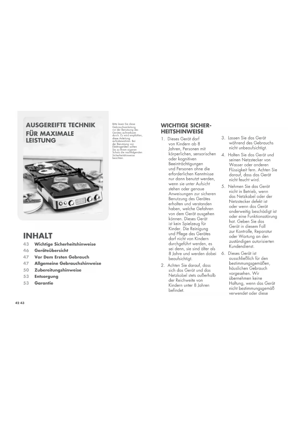 GEBRAUCHSANLEITUNG & GARANTIEBESTIMMUNGEN42 43 INHALT Wichtige SicherheitshinweiseGeräteübersichtVor Dem Ersten GebrauchAllgemeine GebrauchshinweiseZubereitungshinweiseEntsorgungGarantie