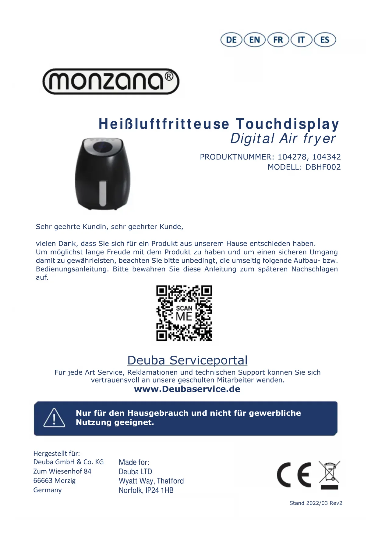 Heißluftfritteuse Touchdisplay Digital Air fryer PRODUKTNUMMER: 104278, 104342 MODELL: DBHF002 Sehr geehrte Kundin, sehr geehrter Kunde,vielen Dank, dass Sie sich für ein Produkt aus unserem Hause entschieden haben. Um möglichst lange Freude mit dem Produkt zu haben und um einen sicheren Umgang damit zu gewährleisten, beachten Sie bitte unbedingt, die umseitig folgende Aufbau- bzw. Bedienungsanleitung. Bitte bewahren Sie diese Anleitung zum späteren Nachschlagen auf. Nur für den Hausgebrauch und nicht für gewerbliche Nutzung geeignet. Deuba Serviceportal Für jede Art Service, Reklamationen und technischen Support können Sie sich vertrauensvoll an unsere geschulten Mitarbeiter wenden. www.Deubaservice.de Hergestellt für: Deuba GmbH & Co. KG Zum Wiesenhof 84 66663 Merzig Germany Made for: Deuba LTD Wyatt Way, Thetford Norfolk, IP24 1HB Stand 2022/03 Rev22