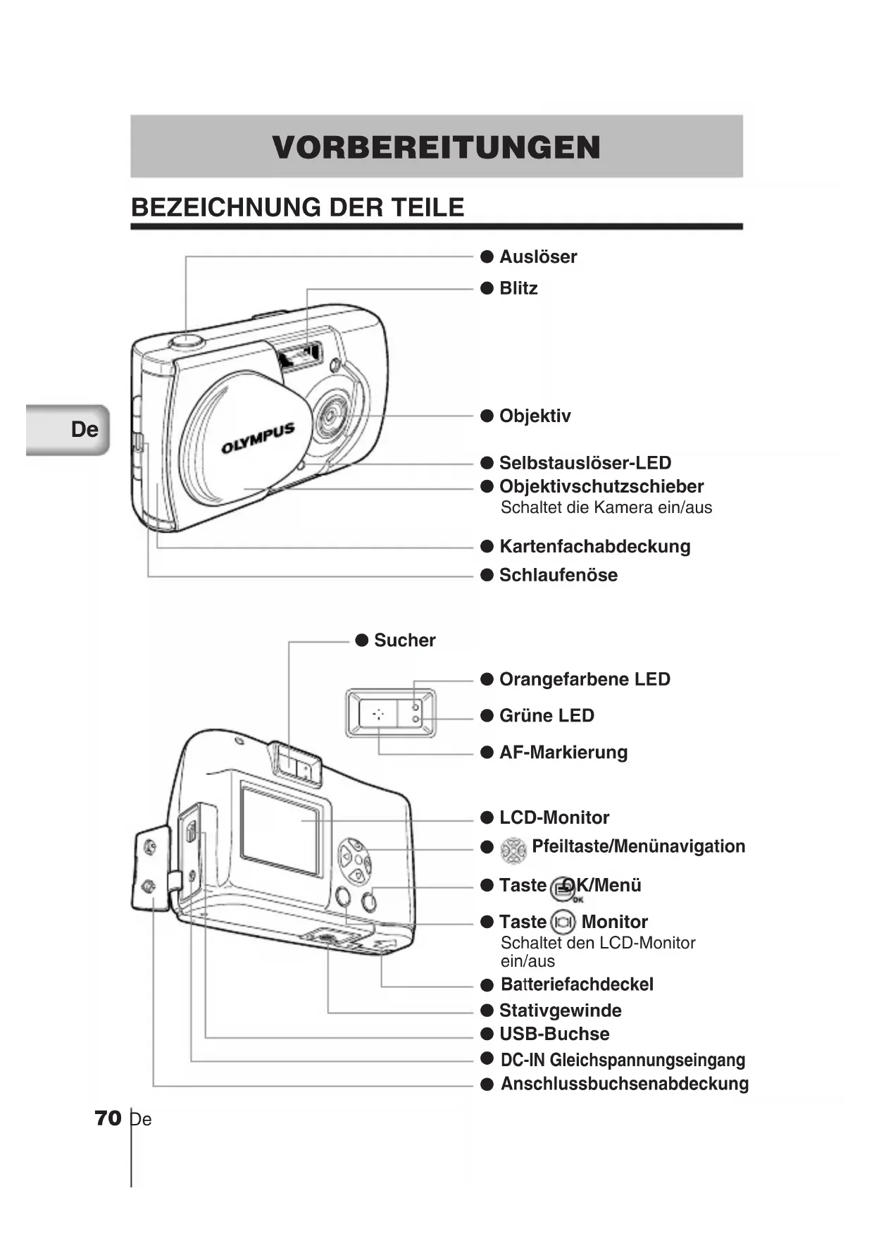 Dieses Symbol kennzeichnet Seiten, die von Erstbenutzern gelesen werden sollten. ★Auf diesen Seiten werden die Aufnahme- und Wiedergabeverfahren erläutert. Die Beschreibungen der mit markierten Abschnitte sind nur in der CD- ROM enthalten. KAMERABETRIEB VORBEREITUNGEN 70 Bezeichnung der Teile ........................................................................ 70 Monitoranzeigen ............................................................................... Anbringen der Handschlaufe ............................................................. 71 Einlegen der Batterien ★ .................................................................. 71 Verwendung handelsüblicher Batterien oder des Netzgerätes .......... 72 Einsetzen der SmartMedia-Karte ★ ................................................. 72 Ein-/Ausschalten der kamera ............................................................. 73 Zur Aufnahme von Bildern .................................................. 73 Zur Wiedergabe von Bildern ............................................... 74 Menübildschirm-Konfiguration .......................................................... Einstellen von Datum und Uhrzeit ★ ................................................ 74 FOTOGRAFIEREN 75 Kamerahaltung ................................................................................. Fotografieren ..................................................................................... 75 Fotografieren mit dem Sucher ★ ........................................ 75 Fotografieren mit dem LCD-Monitor .................................... 75 Vor- und Nachteile von Sucher und LCD-Monitor .............. Funktion der Speicheranzeige ........................................... Funktion der grünen und orangefarbenen LED .................. Entfernungsspeicherung ................................................................... BILDWIEDERGABE 76 Überprüfen aufgenommener Bilder (Wiedergabe) ★ ....................... 76 Schnellansicht (Doppelklick-Wiedergabe im Aufnahmemodus) .......................................................... Löschen einzelner Bilder ★ .............................................................. 76 Schützen wichtiger Bilder ★ ............................................................. 77 3/Basic01_C2-D.65E 8/22/01, 5:07 PM6768 De
