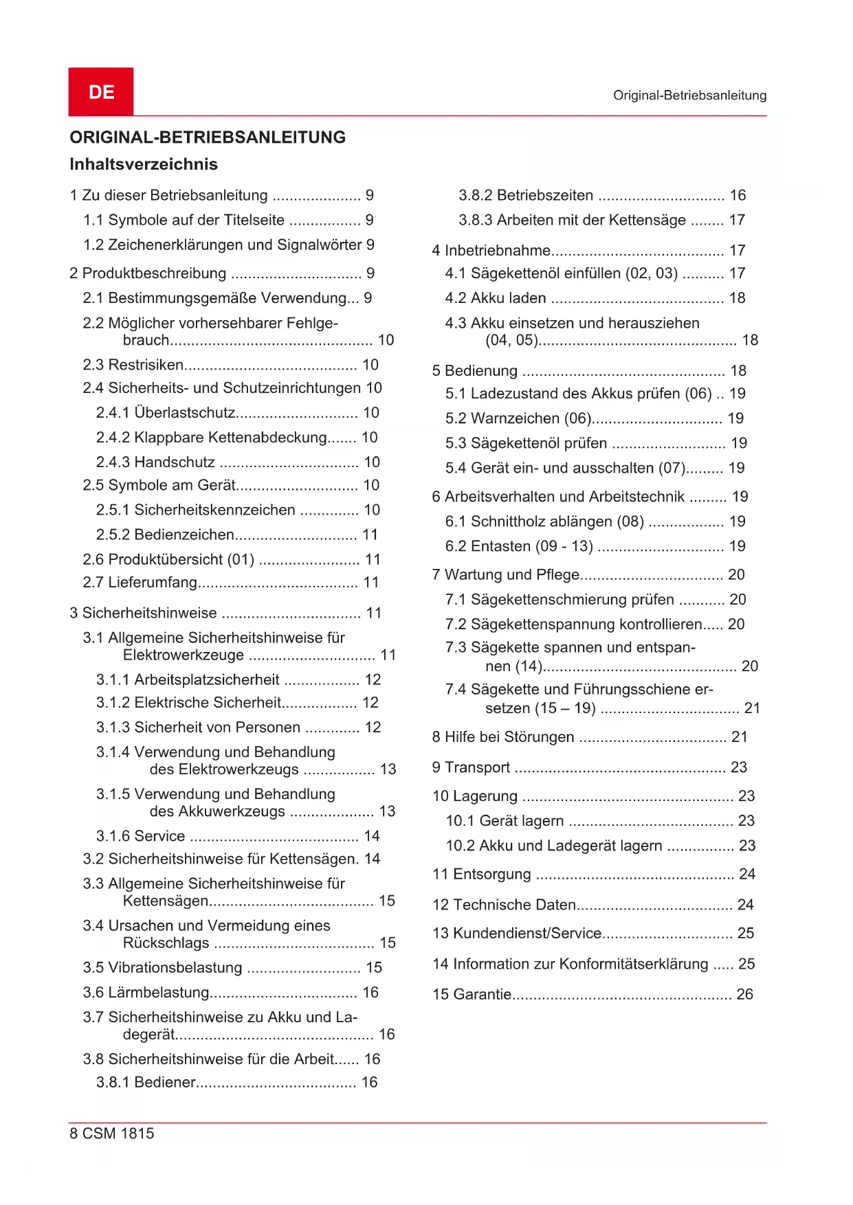 Rücknahmestelle des Herstellers (falls nicht Mitglied des gemeinsamen Rücknahmesys- tems) Diese Aussagen sind nur gültig für Akkus und Batterien, die in den Ländern der Europäischen Union verkauft werden und die der Europäischen Richtlinie 2006/66/EG unterliegen. In Ländern au- ßerhalb der Europäischen Union können davon abweichende Bestimmungen für die Entsorgung von Akkus und Batterien gelten. 12 TECHNISCHE DATEN Kettensäge CSM 1815 Art.-Nr. 114016 Set mit Akku-Gehölzsäge, Akku 2,5Ah und Ladegerät 114023 Abmessungen (LxBxH) 430 x 200 x 85 mm443553_a 25 Kundendienst/Service Kettensäge CSM 1815 Gesamtgewicht mit Kette und Führungsschiene (ohne Akku) 1,56 kg Nettogewicht ohne Kette und Führungsschiene (ohne Akku) 1,28 kg Volumen Kettenöltank 30 ml Schnittlänge 6'' / 152 mm Überlastschutz x Motoreingangsleistung 500 W Motordrehzahl 18500 minˉ¹ Schallleistungspegel L