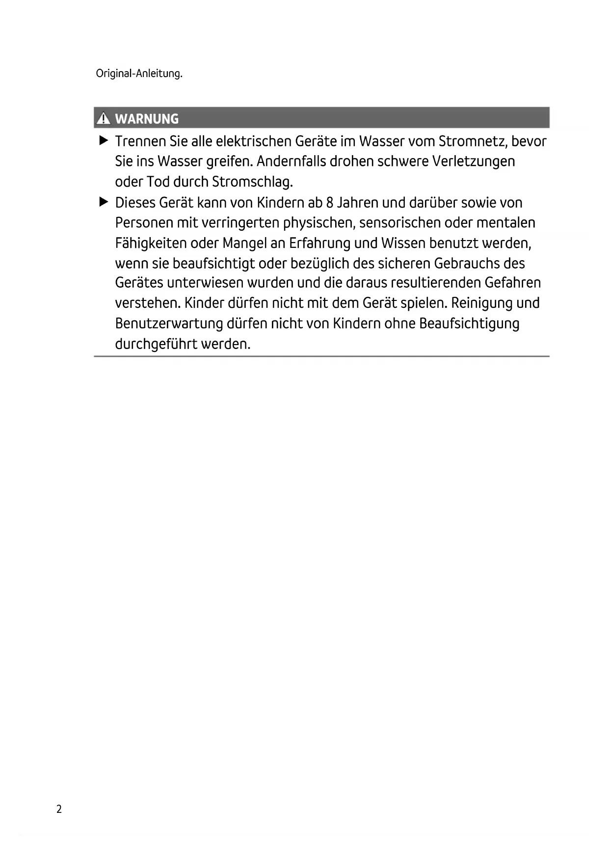 WARNUNG WARNUNG Trennen Sie alle elektrischen Geräte im Wasser vom Stromnetz, bevor Sie ins Wasser greifen. Andernfalls drohen schwere Verletzungen oder Tod durch Stromschlag. Dieses Gerät kann von Kindern ab 8 Jahren und darüber sowie von Personen mit verringerten physischen, sensorischen oder mentalen Fähigkeiten oder Mangel an Erfahrung und Wissen benutzt werden, wenn sie beaufsichtigt oder bezüglich des sicheren Gebrauchs des Gerätes unterwiesen wurden und die daraus resultierenden Gefahren verstehen. Kinder dürfen nicht mit dem Gerät spielen. Reinigung und Benutzerwartung dürfen nicht von Kindern ohne Beaufsichtigung durchgeführt werden.DE