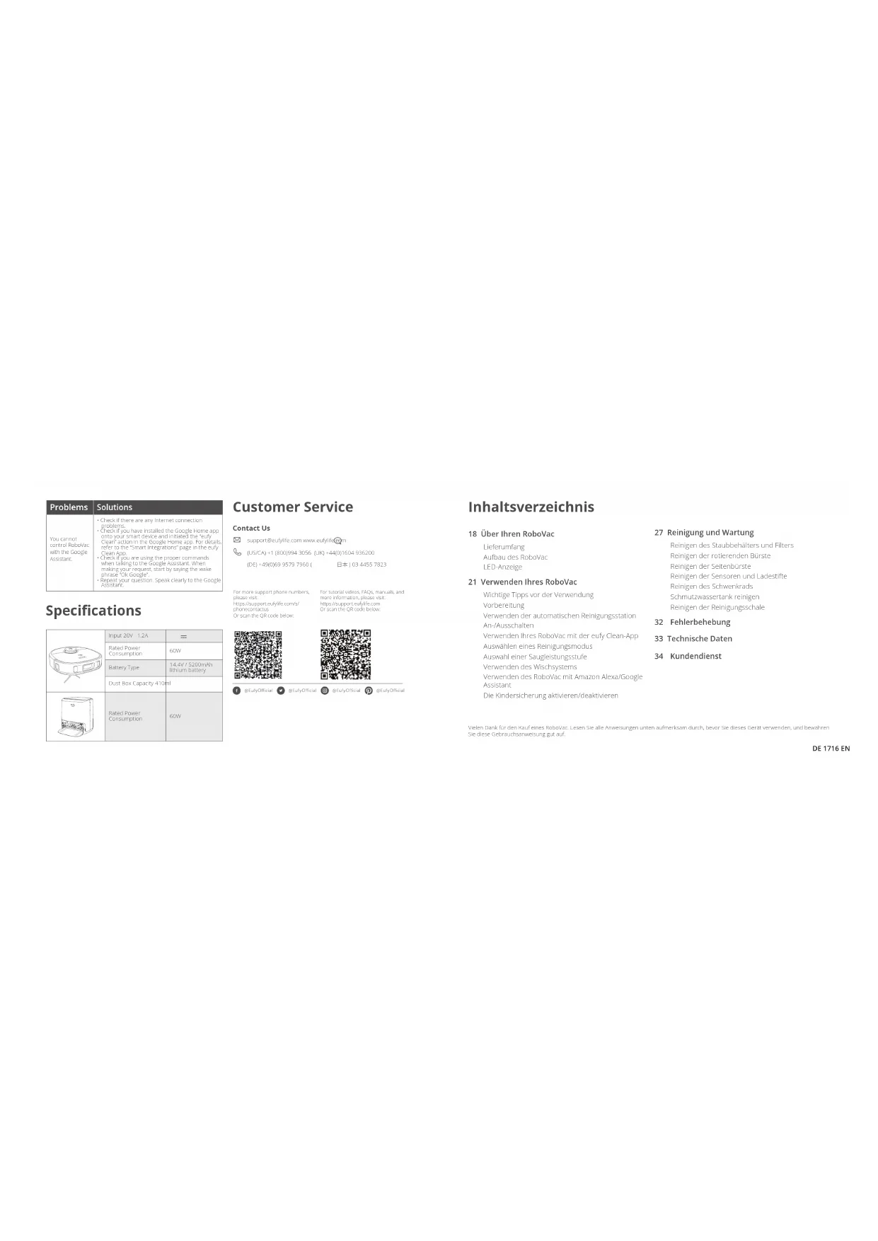 - Wiederholen Sie Ihre Anfrage.Sprechen Sie deutlich, wenn Sie mit dem Google Assistant kommunizieren. Technische Daten Leistungsaufnahme 20V 1,2A Bemessungsleistung 60W Akkutyp 14,4V/5200mAh Lithium-Akku Staubbehälterkapazität 410ml Bemessungsleistung 60WFR 3534 DE Kundendienst Kontakt support@eufylife.com www.eufylife.com (US/CA) +1 (800)994 3056 (UK) +44(0)1604 936200 (DE) +49(0)69 9579 7960 (