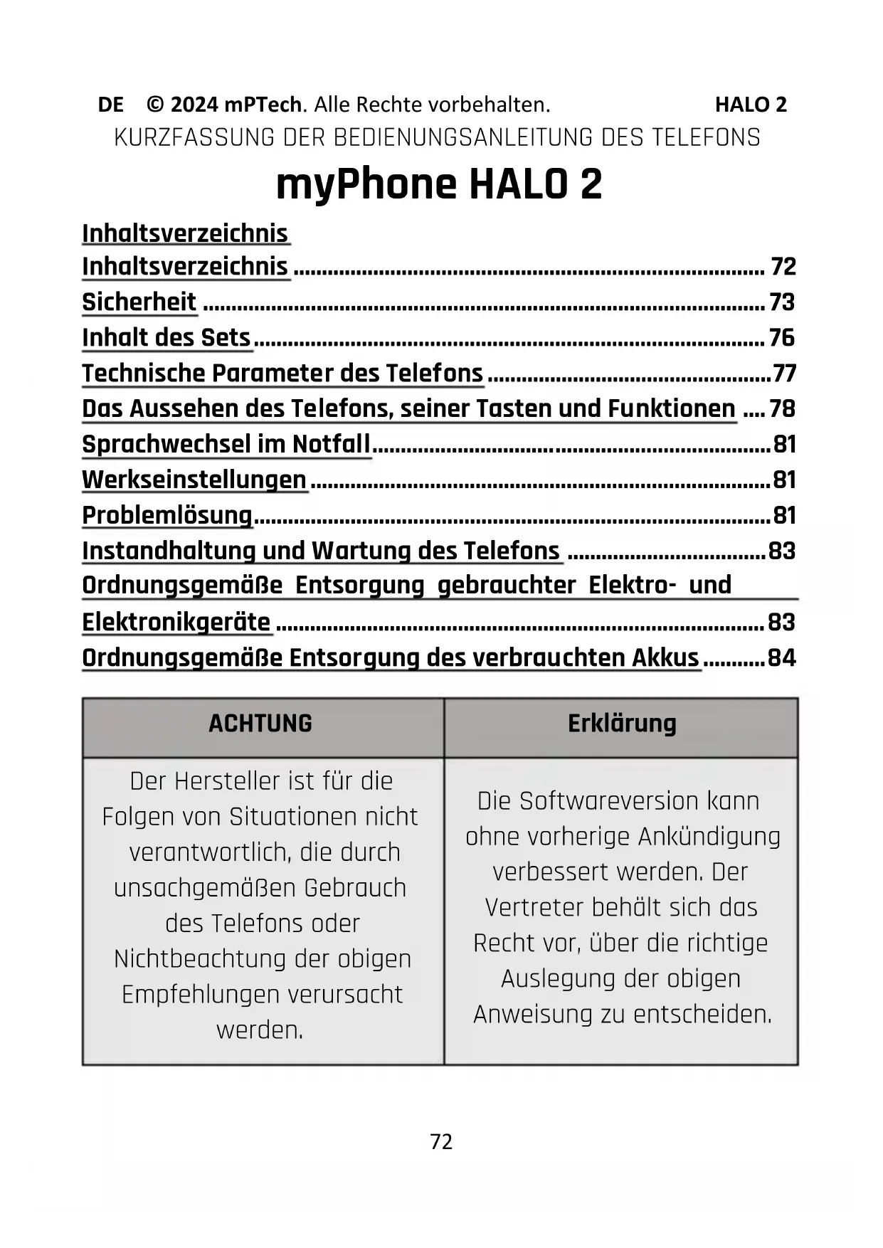 - Ordnungsgemäße Entsorgung des verbrauchten Akkus ACHTUNG Erklärung Der Hersteller ist für die Folgen von Situationen nicht verantwortlich, die durch unsachgemäßen Gebrauch des Telefons oder Nichtbeachtung der obigen Empfehlungen verursacht werden. Die Softwareversion kann ohne vorherige Ankündigung verbessert werden. Der Vertreter behält sich das Recht vor, über die richtige Auslegung der obigen Anweisung zu entscheiden.DE © 2024 mPTech. Alle Rechte vorbehalten. HALO 2 p. 84