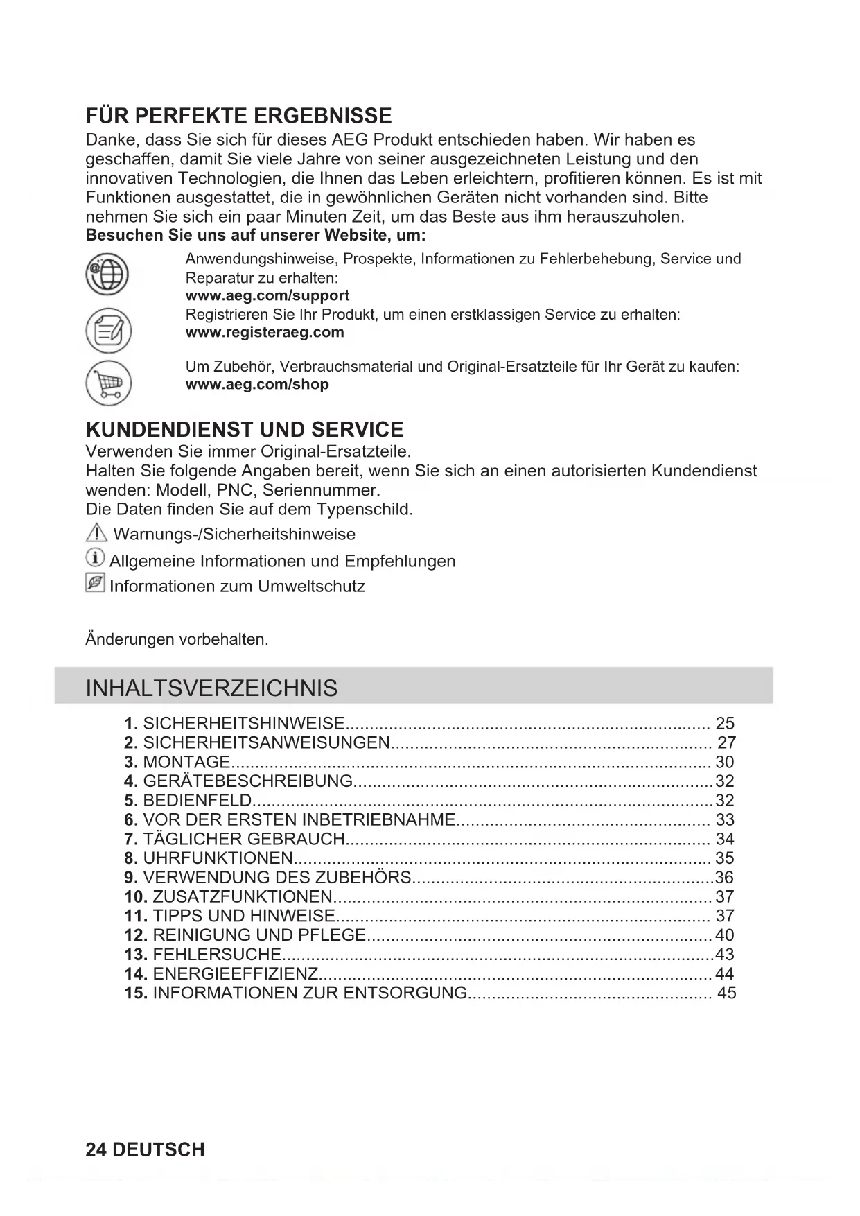 Danke, dass Sie sich für dieses AEG Produkt entschieden haben. Wir haben es geschaffen, damit Sie viele Jahre von seiner ausgezeichneten Leistung und den innovativen Technologien, die Ihnen das Leben erleichtern, profitieren können. Es ist mit Funktionen ausgestattet, die in gewöhnlichen Geräten nicht vorhanden sind. Bitte nehmen Sie sich ein paar Minuten Zeit, um das Beste aus ihm herauszuholen. Besuchen Sie uns auf unserer Website, um: Anwendungshinweise, Prospekte, Informationen zu Fehlerbehebung, Service undReparatur zu erhalten:www.aeg.com/supportRegistrieren Sie Ihr Produkt, um einen erstklassigen Service zu erhalten:www.registeraeg.comUm Zubehör, Verbrauchsmaterial und Original-Ersatzteile für Ihr Gerät zu kaufen:www.aeg.com/shop