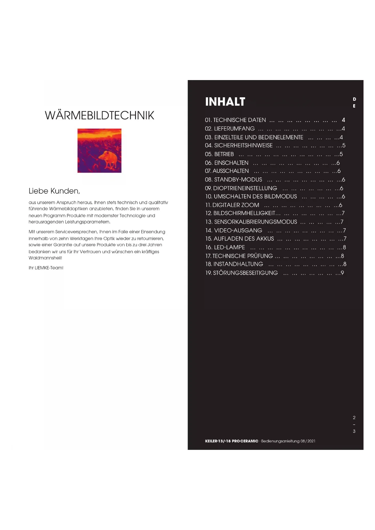 VORSICHT! Das Objektiv des Geräts darf nicht auf intensive Ener- giequellen gerichtet werden, wozu beispielsweise La- sergeräte und die Sonne gehören. Ansonsten besteht die Gefahr, dass elektronische Komponenten des Geräts beschädigt werden. Der Schaden, der infolge Nichtbeachtung der Betriebsanweisungen entsteht, fällt nicht unter die Gewähr leistungsansprüche.KEILER-13/-18 PRO CERAMIC · Bedienungsanleitung 08 / 2021