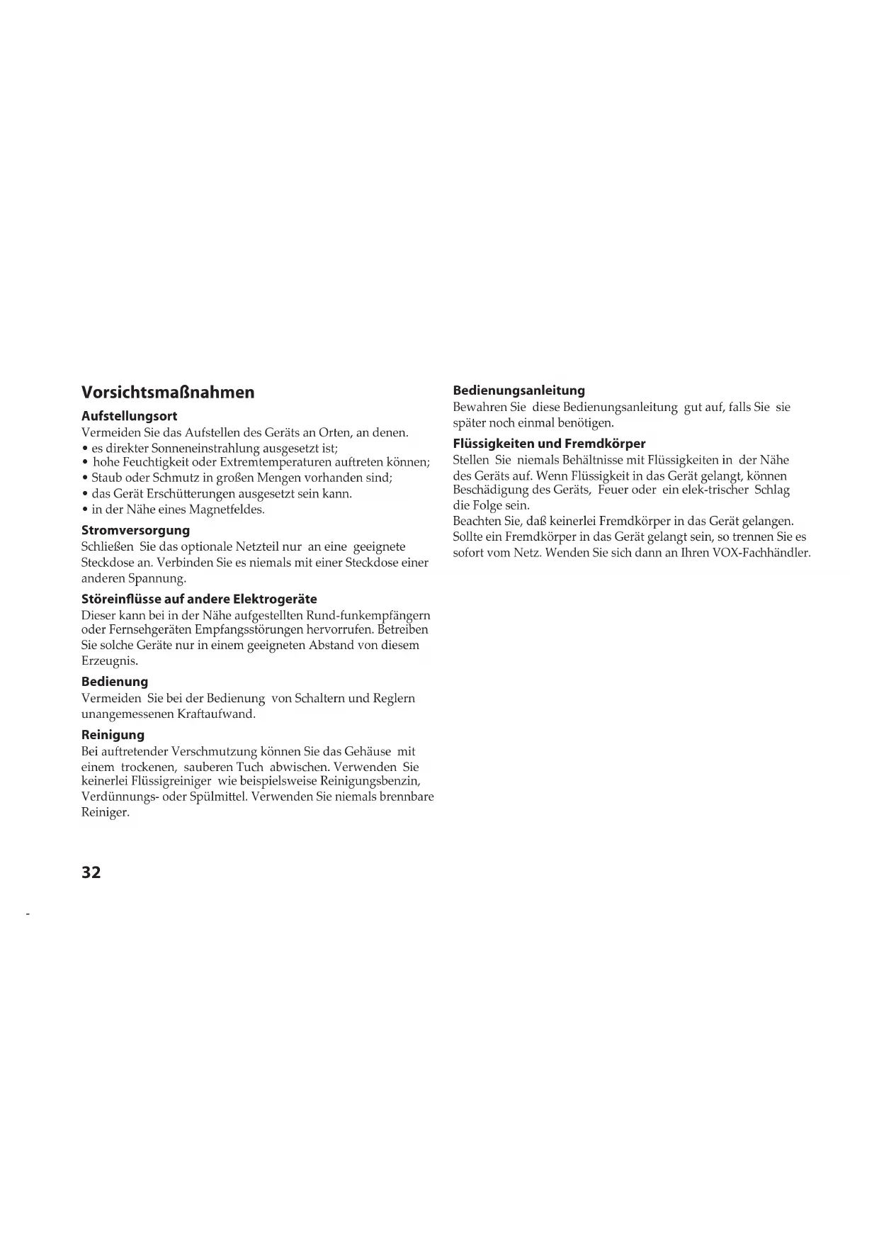 - in der Nähe eines Magnetfeldes. Stromversorgung Schließen Sie das optionale Netzteil nur an eine geeignete Stedose an. Verbinden Sie es niemals mit einer Stedose einer anderen Spannung. Störeinüsse auf andere Elektrogeräte Dieser kann bei in der Nähe aufgestellten Rund-funkempfängern oder Fernsehgeräten Empfangsstörungen hervorrufen. Betreiben Sie sole Geräte nur in einem geeigneten Abstand von diesem Erzeugnis. Bedienung Vermeiden Sie bei der Bedienung von Saltern und Reglern unangemessenen Kraaufwand. Reinigung Bei auretender Versmutzung können Sie das Gehäuse mit einem troenen, sauberen Tu abwisen. Verwenden Sie keinerlei Flüssigreiniger wie beispielsweise Reinigungsbenzin, Verdünnungs- oder Spülmiel. Verwenden Sie niemals brennbare Reiniger. Bedienungsanleitung Bewahren Sie diese Bedienungsanleitung gut auf, falls Sie sie später no einmal benötigen. Flüssigkeiten und Fremdkörper Stellen Sie niemals Behältnisse mit Flüssigkeiten in der Nähe des Geräts auf. Wenn Flüssigkeit in das Gerät gelangt, können Besädigung des Geräts, Feuer oder ein elek-triser Slag die Folge sein. Beaten Sie, daß keinerlei Fremdkörper in das Gerät gelangen. Sollte ein Fremdkörper in das Gerät gelangt sein, so trennen Sie es sofort vom Netz. Wenden Sie si dann an Ihren VOX-Fahändler.33 Hinweis zur Entsorgung (Nur EU) Wenn Sie das Symbol mit der „durchgekreuzten Mülltonne“ auf Ihrem Produkt, der dazugehörigen Bedienungsanleitung, der Baerie oder dem Baeriefa sehen, müssen Sie das Produkt in der vorgesriebenen Art und Weise entsorgen. Dies bedeutet, dass dieses Produkt mit elektrischen und elektronischen Komponenten nit mit dem normalen Hausmüll entsorgt werden darf. Für Produkte dieser Art existiert ein separates, gesetzli festgelegtes Entsorgungssystem. Gebraute elektrise und elektronise Geräte müssen separat entsorgt werden, um ein umweltgeretes Recycling sierzustellen. Diese Produkte müssen bei benannten Sammelstellen abgegeben werden. Die Entsorgung ist für den Endverbrauer kostenfrei! Bie erkundigen sie si bei ihrer zuständigen Behörde, wo sie diese Produkte zur fagereten Entsorgung abgeben können. Falls ihr Produkt mit Baerien oder Akkumulatoren ausgerüstet ist, müssen sie diese vor Abgabe des Produktes entfernen und separat entsorgen (siehe oben). Die Abgabe dieses Produktes bei einer zuständigen Stelle hil ihnen, dass das Produkt umweltgeret entsorgt wird. Damit leisten sie persönli einen nit unerheblien Beitrag zum Sutz der Umwelt und der menslien Gesundheit vor möglien negativen Eekten dur unsagemäße Entsorgung von Müll. Baerien oder Akkus, die Sadstoe enthalten, sind auch mit dem Symbol einer durchgekreuzten Mülltonne gekennzeinet. In der Nähe zum Mülltonnensymbol bendet si die emise Bezeinung des Sadstoes. Cd oder NiCd steht für Cadmium, Pb für Blei und Hg für Quesilber.