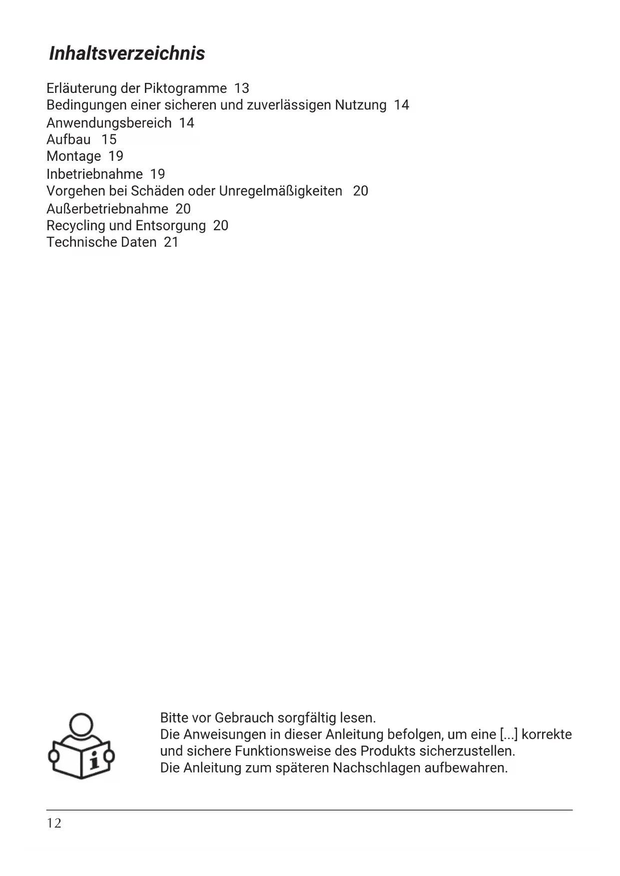 PL12 Inhaltsverzeichnis Erläuterung der Piktogramme 13 Bedingungen einer sicheren und zuverlässigen Nutzung 14 Anwendungsbereich 14 Aufbau 15 Montage 19 Inbetriebnahme 19 Vorgehen bei Schäden oder Unregelmäßigkeiten 20 Außerbetriebnahme 20 Recycling und Entsorgung 20 Technische Daten 21 Bitte vor Gebrauch sorgfältig lesen. Die Anweisungen in dieser Anleitung befolgen, um eine [...] korrekte und sichere Funktionsweise des Produkts sicherzustellen. Die Anleitung zum späteren Nachschlagen aufbewahren.13 PL;DE;EN;ES;FR;NL;HR;HU;RO-061_f.1973 Bitte die Sicherheitshinweise sorgfältig befolgen, um Gesundheits- und Sachschäden auszuschließen. Gefahr Dieses Zeichen warnt vor Verletzungsgefahr. Achtung Dieses Zeichen warnt vor Sachschäden und Umweltverschmutzung. Hinweis Text, der mit dem Wort Hinweis gekennzeichnet ist, enthält zusätzliche Informationen. Ein Hinweis darauf, dass die Bedienungsanleitung bei der Bedienung oder Steuerung des Geräts in der Nähe der Stelle, an der das Symbol angebracht ist, gelesen werden sollte. Erläuterung der Piktogramme Geltende Vorschriften