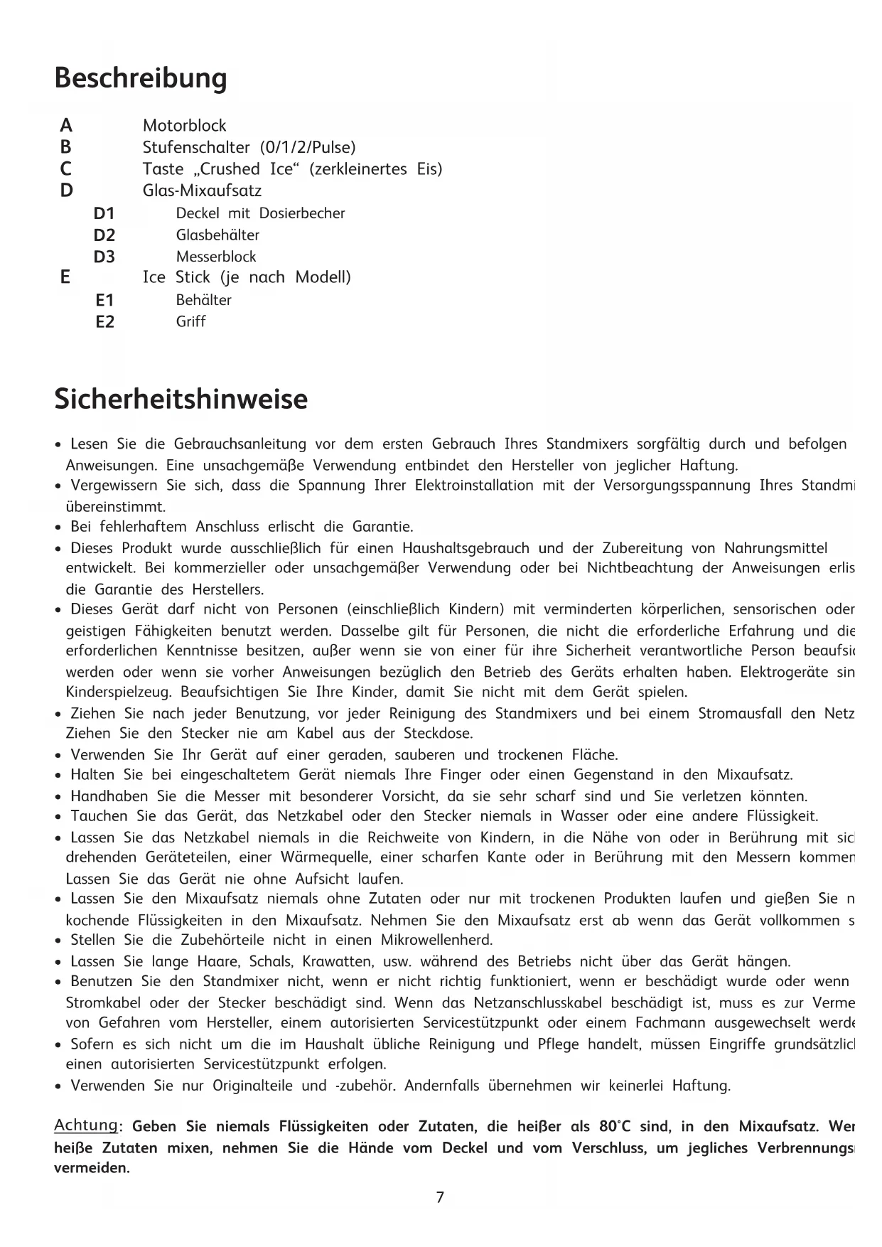 Motorblock Stufenschalter (0/1/2/Pulse) Taste „Crushed Ice“ (zerkleinertes Eis) Glas-Mixaufsatz Deckel mit Dosierbecher Glasbehälter Messerblock Ice Stick (je nach Modell) Behälter Griff Sicherheitshinweise