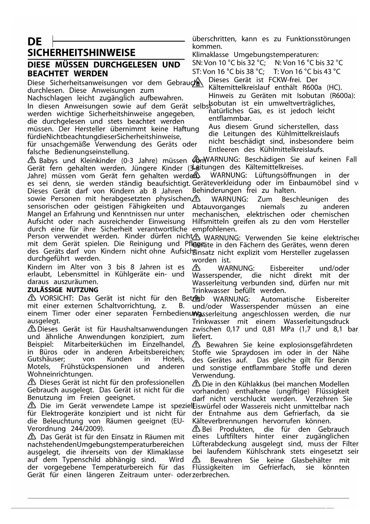 VORSICHT: Das Gerät ist nicht für den Betrieb mit einer externen Schaltvorrichtung, z. B. einem Timer oder einer separaten Fernbedienung, ausgelegt. Dieses Gerät ist für Haushaltsanwendungen und ähnliche Anwendungen konzipiert, zum Beispiel: Mitarbeiterküchen im Einzelhandel, in Büros oder in anderen Arbeitsbereichen; Gutshäuser; von Kunden in Hotels, Motels, Frühstückspensionen und anderen Wohneinrichtungen. Dieses Gerät ist nicht für den professionellen Gebrauch ausgelegt. Das Gerät ist nicht für die Benutzung im Freien geeignet. Die im Gerät verwendete Lampe ist speziell für Elektrogeräte konzipiert und ist nicht für die Beleuchtung von Räumen geeignet (EU Verordnung 244/2009). Das Gerät ist für den Einsatz in Räumen mit nachstehendenUmgebungstemperaturbereichen ausgelegt, die ihrerseits von der Klimaklasse auf dem Typenschild abhängig sind. Wird der vorgegebene Temperaturbereich für das Gerät für einen längeren Zeitraum unter oder überschritten, kann es zu Funktionsstörungen kommen. Klimaklasse Umgebungstemperaturen: SN: Von 10 °C bis 32 °C; N: Von 16 °C bis 32 °C ST: Von 16 °C bis 38 °C; T: Von 16 °C bis 43 °C Dieses Gerät ist FCKWfrei. Der Kältemittelkreislauf enthält R600a (HC). Hinweis zu Geräten mit Isobutan (R600a): Isobutan ist ein umweltverträgliches, natürliches Gas, es ist jedoch leicht entflammbar. Aus diesem Grund sicherstellen, dass die Leitungen des Kühlmittelkreislaufs nicht beschädigt sind, insbesondere beim Entleeren des Kühlmittelkreislaufs. WARNUNG: Beschädigen Sie auf keinen Fall die Leitungen des Kältemittelkreises. WARNUNG: Lüftungsöffnungen in der Geräteverkleidung oder im Einbaumöbel sind von Behinderungen frei zu halten. WARNUNG: Zum Beschleunigen des Abtauvorganges niemals zu anderen mechanischen, elektrischen oder chemischen Hilfsmitteln greifen als zu den vom Hersteller empfohlenen. WARNUNG: Verwenden Sie keine elektrischen Geräte in den Fächern des Gerätes, wenn deren Einsatz nicht explizit vom Hersteller zugelassen worden ist. WARNUNG: Eisbereiter und/oder Wasserspender, die nicht direkt mit der Wasserleitung verbunden sind, dürfen nur mit Trinkwasser befüllt werden. WARNUNG: Automatische Eisbereiter und/oder Wasserspender müssen an eine Wasserleitung angeschlossen werden, die nur Trinkwasser mit einem Wasserleitungsdruck zwischen 0,17 und 0,81 MPa (1,7 und 8,1 bar) liefert. Bewahren Sie keine explosionsgefährdeten Stoffe wie Spraydosen im oder in der Nähe des Gerätes auf. Das gleiche gilt für Benzin und sonstige entflammbare Stoffe und deren Verwendung. Die in den Kühlakkus (bei manchen Modellen vorhanden) enthaltene (ungiftige) Flüssigkeit darf nicht verschluckt werden. Verzehren Sie Eiswürfel oder Wassereis nicht unmittelbar nach der Entnahme aus dem Gefrierfach, da sie Kälteverbrennungen hervorrufen können. Bei Produkten, die für den Gebrauch eines Luftfilters hinter einer zugänglichen Lüfterabdeckung ausgelegt sind, muss der Filter bei laufendem Kühlschrank stets eingesetzt sein. Bewahren Sie keine Glasbehälter mit Flüssigkeiten im Gefrierfach, sie könnten zerbrechen.Blockieren Sie das Gebläse (falls inbegriffen) nicht mit Lebensmitteln. Prüfen Sie nach dem Ablegen von Lebensmitteln, ob die Tür der Fächer korrekt schließt, besonders die Tür des Gefrierfachs. Beschädigte Dichtungen müssen so schnell wie möglich ausgetauscht werden. Verwenden Sie das Kühlfach nur zur Aufbewahrung von frischen Lebensmitteln und das Gefrierfach nur zur Aufbewahrung von gefrorenen Lebensmitteln, zum Einfrieren von frischen Lebensmitteln und zur Herstellung von Eiswürfeln. Unverpackte Lebensmittel so lagern, dass sie nicht mit den Innenwänden des Kühl bzw. Gefrierfachs in Berührung kommen. Möglicherweise verfügt das Gerät über Sonderfächer (Frischefach, NullGradBox, ...). Falls nicht anderweitig in der Anleitung des Gerätes anders angegeben, können diese für eine gleichmäßige Funktion im gesamten Gerät herausgenommen werden. Das brennbare Gas CPentan wird als Treibmittel im Isolierschaum eingesetzt. Folgende Fächer des Geräts eignen sich am besten zur Aufbewahrung verschiedener Arten von Lebensmitteln, unter Berücksichtigung der unterschiedlichen Temperaturverteilung in verschiedenen Fächern des Geräts: