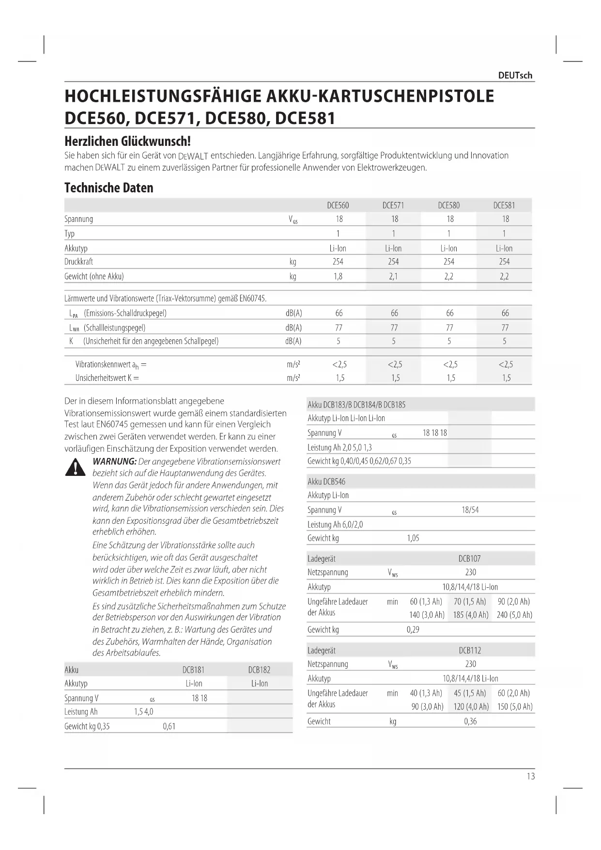 WARNUNG: Der angegebene Vibrationsemissionswert bezieht sich auf die Hauptanwendung des Gerätes. Wenn das Gerät jedoch für andere Anwendungen, mit anderem Zubehör oder schlecht gewartet eingesetzt wird, kann die Vibrationsemission verschieden sein. Dies kann den Expositionsgrad über die Gesamtbetriebszeit erheblicherhöhen. Eine Schätzung der Vibrationsstärke sollte auch berücksichtigen, wie oft das Gerät ausgeschaltet wird oder über welche Zeit es zwar läuft, aber nicht wirklich in Betrieb ist. Dies kann die Exposition über die Gesamtbetriebszeit erheblichmindern. Es sind zusätzliche Sicherheitsmaßnahmen zum Schutze der Betriebsperson vor den Auswirkungen der Vibration in Betracht zu ziehen, z.B.: Wartung des Gerätes und des Zubehörs, Warmhalten der Hände, Organisation desArbeitsablaufes. Akku DCB181 DCB182 Akkutyp Li-Ion Li-Ion Spannung V