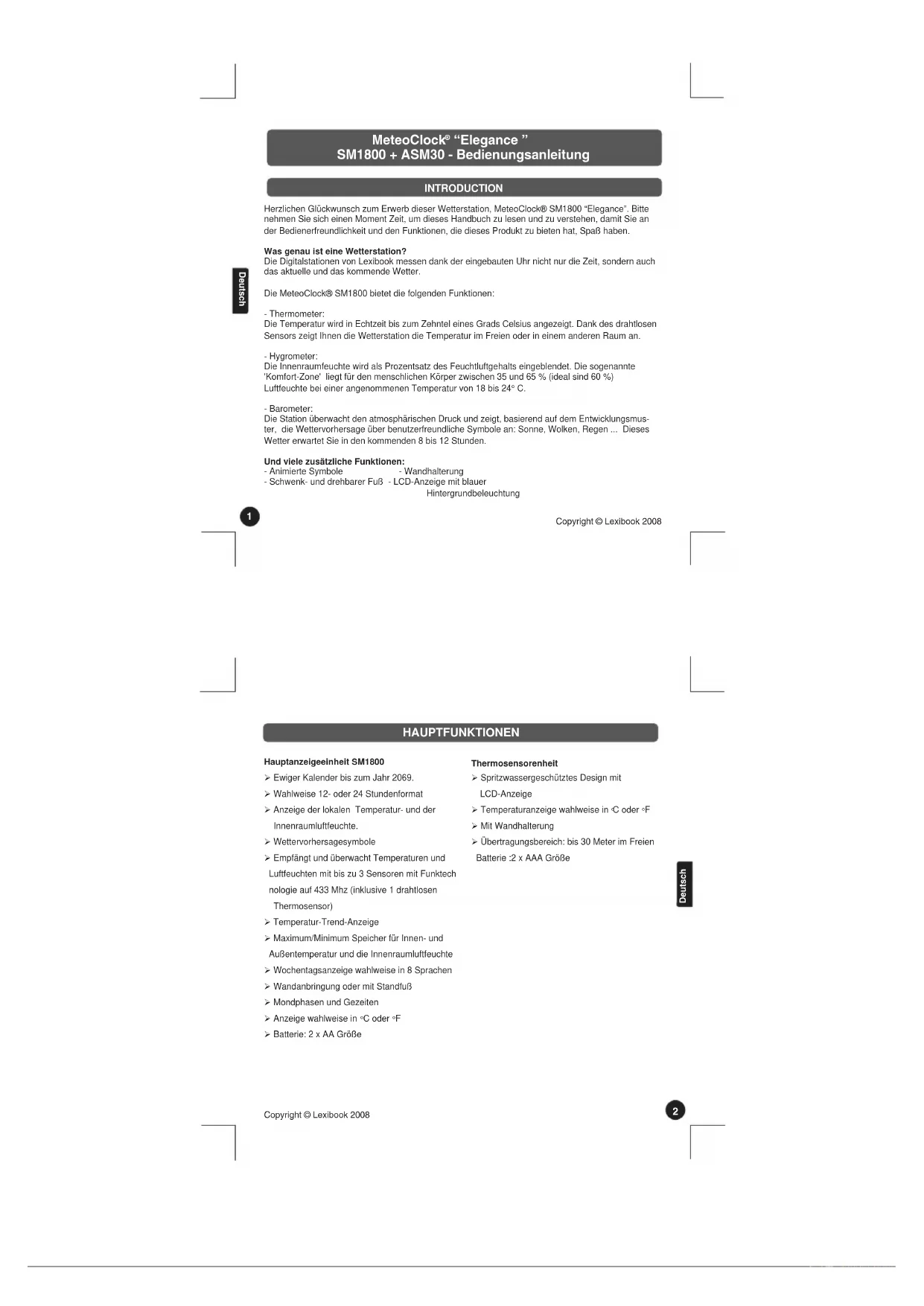 Deutsch Deutsch Herzlichen Glückwunsch zum Erwerb dieser Wetterstation, MeteoClock® SM1800 “Elegance”. Bitte nehmen Sie sich einen Moment Zeit, um dieses Handbuch zu lesen und zu verstehen, damit Sie an der Bedienerfreundlichkeit und den Funktionen, die dieses Produkt zu bieten hat, Spaß haben. Was genau ist eine Wetterstation? Die Digitalstationen von Lexibook messen dank der eingebauten Uhr nicht nur die Zeit, sondern auch das aktuelle und das kommende Wetter. Die MeteoClock® SM1800 bietet die folgenden Funktionen: - Thermometer: Die Temperatur wird in Echtzeit bis zum Zehntel eines Grads Celsius angezeigt. Dank des drahtlosen Sensors zeigt Ihnen die Wetterstation die Temperatur im Freien oder in einem anderen Raum an. - Hygrometer: Die Innenraumfeuchte wird als Prozentsatz des Feuchtluftgehalts eingeblendet. Die sogenannte 'Komfort-Zone' liegt für den menschlichen Körper zwischen 35 und 65 % (ideal sind 60 %) Luftfeuchte bei einer angenommenen Temperatur von 18 bis 24° C. - Barometer: Die Station überwacht den atmosphärischen Druck und zeigt, basierend auf dem Entwicklungsmus- ter, die Wettervorhersage über benutzerfreundliche Symbole an: Sonne, Wolken, Regen ... Dieses Wetter erwartet Sie in den kommenden 8 bis 12 Stunden. Und viele zusätzliche Funktionen: - Animierte Symbole - Wandhalterung - Schwenk- und drehbarer Fuß - LCD-Anzeige mit blauer Hintergrundbeleuchtung Hauptanzeigeeinheit SM1800 ÿ Ewiger Kalender bis zum Jahr 2069. ÿ Wahlweise 12- oder 24 Stundenformat ÿ Anzeige der lokalen Temperatur- und der Innenraumluftfeuchte. ÿ Wettervorhersagesymbole ÿ Empfängt und überwacht Temperaturen und Luftfeuchten mit bis zu 3 Sensoren mit Funktech nologie auf 433 Mhz (inklusive 1 drahtlosen Thermosensor) ÿ Temperatur-Trend-Anzeige ÿ Maximum/Minimum Speicher für Innen- und Außentemperatur und die Innenraumluftfeuchte ÿ Wochentagsanzeige wahlweise in 8 Sprachen ÿ Wandanbringung oder mit Standfuß ÿ Mondphasen und Gezeiten ÿ Anzeige wahlweise in