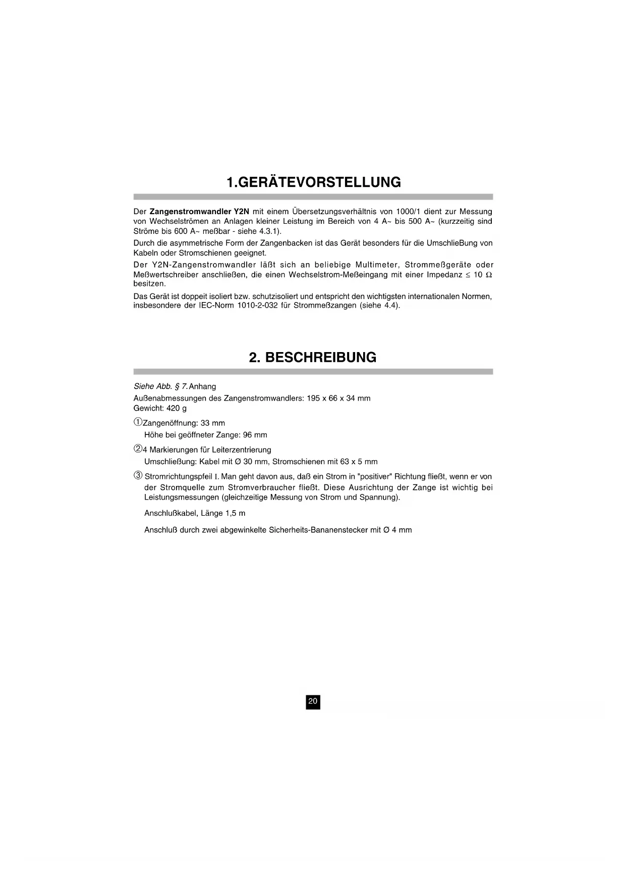 5. WARTUNG ..................................................................................................................................... 25 5.1 PFLEGE .................................................................................................................................. 25 5.2 NACHKALIBRIERUNG ...........................................................................................................25 5.3 REPARATUREN ...................................................................................................................... 25 6. GARANTIE ..................................................................................................................................... 25 7. ANHANG ........................................................................................................................................ 42 BESTELLANGABEN Zangenstromwandler Y2N ............................................................................................... P01120028A20 1.GERÄTEVORSTELLUNG Der Zangenstromwandler Y2N mit einem Übersetzungsverhältnis von 1000/1 dient zur Messung von Wechselströmen an Anlagen kleiner Leistung im Bereich von 4 A~ bis 500 A~ (kurzzeitig sind Ströme bis 600 A~ meßbar - siehe 4.3.1). Durch die asymmetrische Form der Zangenbacken ist das Gerät besonders für die UmschlieBung von Kabeln oder Stromschienen geeignet. Der Y2N-Zangenstromwandler läßt sich an beliebige Multimeter, Strommeßgeräte oder Meßwertschreiber anschließen, die einen Wechselstrom-Meßeingang mit einer Impedanz ≤ 10 Ω besitzen. Das Gerät ist doppeit isoliert bzw. schutzisoliert und entspricht den wichtigsten internationalen Normen, insbesondere der IEC-Norm 1010-2-032 für Strommeßzangen (siehe 4.4).