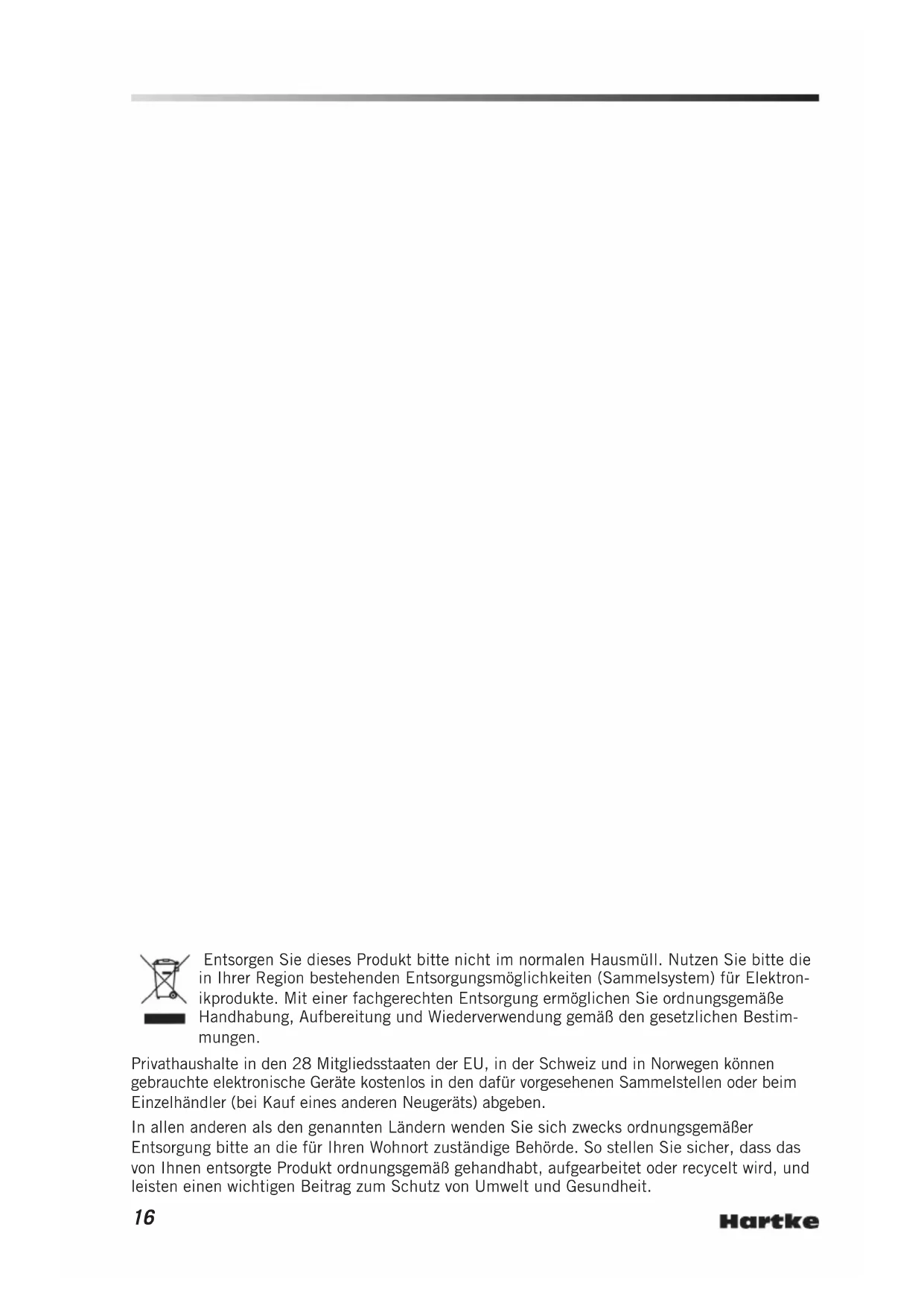 Caractéristiques techniques HD210 Description Baffle de basses 2 x 10” Type d'enceinte Caisson fermé Impédance de l'enceinte 8 Ohms Haut-parleurs LF 250 watt, 10", cône hybride en papier et aluminium Haut-parleur HF 1", haut-parleur haute fréquence Contrôle niveau HF interrupteur 3 positions (0, -6 dB, Off) Gestion de la puissance 500Watts RMS Réponse de fréquence 50Hz - 17kHz -3dB -10dB Réponse fréquence basse 35Hz Dimensions 14,5” x 24” x 15” 371 mm x 612 mm x 383 mm Poids 37,7 lb 17,1 kg HD112 Description Baffle de basses 1 x 12” Type d'enceinte caisson de basses ventilé Impédance de l'enceinte 4 ou 8 Ohms à sélectionner Haut-parleurs LF 300 watt, 12", cône hybride en papier et aluminium HF 1", haut-parleut haute fréquence Contrôle niveau HF interrupteur 3 positions (0, -6 dB, Off) Gestion de la puissance 300Watts RMS Réponse de fréquence 35Hz - 17kHz -3dB -10dB Réponse fréquence basse 25Hz Dimensions 19” x 15” x 16” 487 mm x 381 mm x 404 mm Poids 30,9 lb 14 kg Chez Hartke, nous améliorons en permanence nos produits; par conséquent, les caractéristiques techniques et les images sont susceptibles d'être modifiées sans préavis.16 Entsorgen Sie dieses Produkt bitte nicht im normalen Hausmüll. Nutzen Sie bitte die in Ihrer Region bestehenden Entsorgungsmöglichkeiten (Sammelsystem) für Elektron- ikprodukte. Mit einer fachgerechten Entsorgung ermöglichen Sie ordnungsgemäße Handhabung, Aufbereitung und Wiederverwendung gemäß den gesetzlichen Bestim- mungen. Privathaushalte in den 28 Mitgliedsstaaten der EU, in der Schweiz und in Norwegen können gebrauchte elektronische Geräte kostenlos in den dafür vorgesehenen Sammelstellen oder beim Einzelhändler (bei Kauf eines anderen Neugeräts) abgeben. In allen anderen als den genannten Ländern wenden Sie sich zwecks ordnungsgemäßer Entsorgung bitte an die für Ihren Wohnort zuständige Behörde. So stellen Sie sicher, dass das von Ihnen entsorgte Produkt ordnungsgemäß gehandhabt, aufgearbeitet oder recycelt wird, und leisten einen wichtigen Beitrag zum Schutz von Umwelt und Gesundheit.17 HyDrive Boxen der HD-Serie ENGLISH