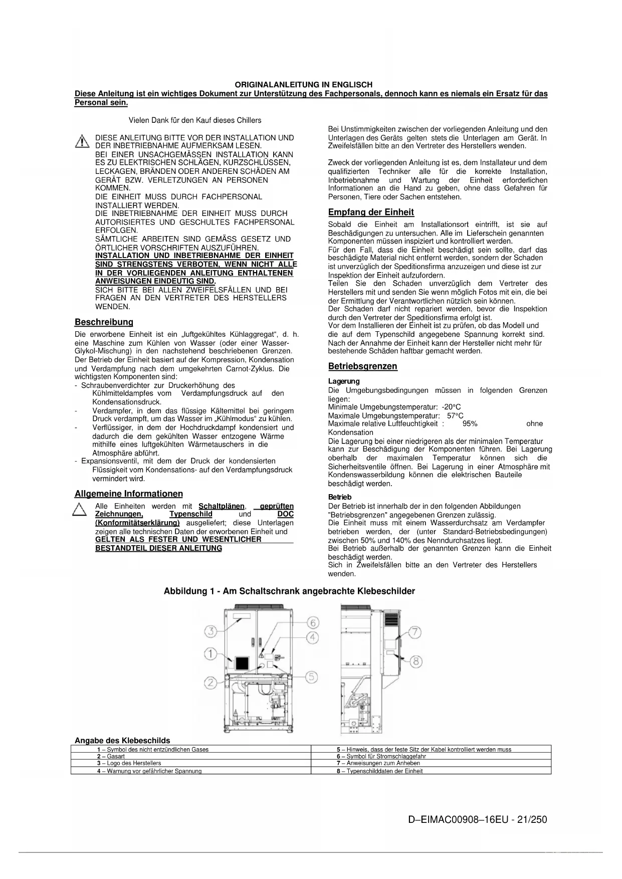 Bei Unstimmigkeiten zwischen der vorliegenden Anleitung und den Unterlagen des Geräts gelten stets die Unterlagen am Gerät. In Zweifelsfällen bitte an den Vertreter des Herstellers wenden. Zweck der vorliegenden Anleitung ist es, dem Installateur und dem qualifizierten Techniker alle für die korrekte Installation, Inbetriebnahme und Wartung der Einheit erforderlichen Informationen an die Hand zu geben, ohne dass Gefahren für Personen, Tiere oder Sachen entstehen. Empfang der Einheit Sobald die Einheit am Installationsort eintrifft, ist sie auf Beschädigungen zu untersuchen. Alle im Lieferschein genannten Komponenten müssen inspiziert und kontrolliert werden. Für den Fall, dass die Einheit beschädigt sein sollte, darf das beschädigte Material nicht entfernt werden, sondern der Schaden ist unverzüglich der Speditionsfirma anzuzeigen und diese ist zur Inspektion der Einheit aufzufordern. Teilen Sie den Schaden unverzüglich dem Vertreter des Herstellers mit und senden Sie wenn möglich Fotos mit ein, die bei der Ermittlung der Verantwortlichen nützlich sein können. Der Schaden darf nicht repariert werden, bevor die Inspektion durch den Vertreter der Speditionsfirma erfolgt ist. Vor dem Installieren der Einheit ist zu prüfen, ob das Modell und die auf dem Typenschild angegebene Spannung korrekt sind. Nach der Annahme der Einheit kann der Hersteller nicht mehr für bestehende Schäden haftbar gemacht werden. Betriebsgrenzen Lagerung Die Umgebungsbedingungen müssen in folgenden Grenzen liegen: Minimale Umgebungstemperatur: -20°C Maximale Umgebungstemperatur: 57°C Maximale relative Luftfeuchtigkeit : 95% ohne Kondensation Die Lagerung bei einer niedrigeren als der minimalen Temperatur kann zur Beschädigung der Komponenten führen. Bei Lagerung oberhalb der maximalen Temperatur können sich die Sicherheitsventile öffnen. Bei Lagerung in einer Atmosphäre mit Kondenswasserbildung können die elektrischen Bauteile beschädigt werden. Betrieb Der Betrieb ist innerhalb der in den folgenden Abbildungen "Betriebsgrenzen" angegebenen Grenzen zulässig. Die Einheit muss mit einem Wasserdurchsatz am Verdampfer betrieben werden, der (unter Standard-Betriebsbedingungen) zwischen 50% und 140% des Nenndurchsatzes liegt. Bei Betrieb außerhalb der genannten Grenzen kann die Einheit beschädigt werden. Sich in Zweifelsfällen bitte an den Vertreter des Herstellers wenden. Abbildung 1 - Am Schaltschrank angebrachte Klebeschilder
