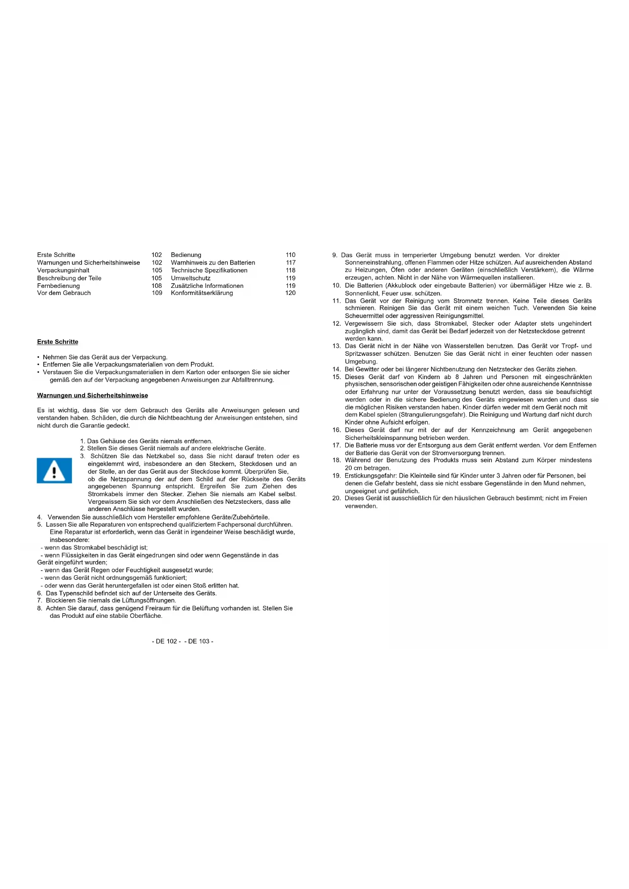 LESEN SIE DIESE ANLEITUNG BITTE VOR GEBRAUCH DES GERÄTS SORGFÄLTIG DURCH UND BEWAHREN SIE SIE ZUR SPÄTEREN EINSICHTNAHME AUF.- DE 102 - - DE 103 - Erste Schritte