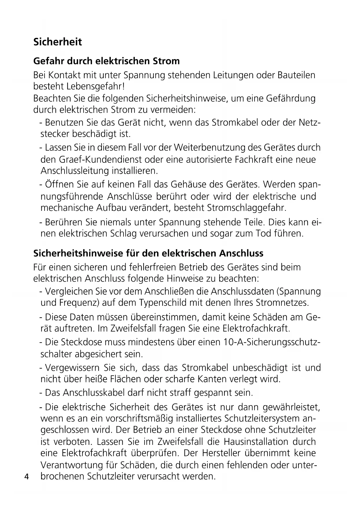- Gewährleistung Sicherheit Gefahr durch elektrischen Strom Bei Kontakt mit unter Spannung stehenden Leitungen oder Bauteilen besteht Lebensgefahr! Beachten Sie die folgenden Sicherheitshinweise, um eine Gefährdung durch elektrischen Strom zu vermeiden: - Benutzen Sie das Gerät nicht, wenn das Stromkabel oder der Netz- stecker beschädigt ist. - Lassen Sie in diesem Fall vor der Weiterbenutzung des Gerätes durch den Graef-Kundendienst oder eine autorisierte Fachkraft eine neue Anschlussleitung installieren. - Öffnen Sie auf keinen Fall das Gehäuse des Gerätes. Werden span- nungsführende Anschlüsse berührt oder wird der elektrische und mechanische Aufbau verändert, besteht Stromschlaggefahr. - Berühren Sie niemals unter Spannung stehende Teile. Dies kann ei- nen elektrischen Schlag verursachen und sogar zum Tod führen. Sicherheitshinweise für den elektrischen Anschluss Für einen sicheren und fehlerfreien Betrieb des Gerätes sind beim elektrischen Anschluss folgende Hinweise zu beachten: - Vergleichen Sie vor dem Anschließen die Anschlussdaten (Spannung und Frequenz) auf dem Typenschild mit denen Ihres Stromnetzes. - Diese Daten müssen übereinstimmen, damit keine Schäden am Ge- rät auftreten. Im Zweifelsfall fragen Sie eine Elektrofachkraft. - Die Steckdose muss mindestens über einen 10-A-Sicherungsschutz- schalter abgesichert sein. - Vergewissern Sie sich, dass das Stromkabel unbeschädigt ist und nicht über heiße Flächen oder scharfe Kanten verlegt wird. - Das Anschlusskabel darf nicht straff gespannt sein. - Die elektrische Sicherheit des Gerätes ist nur dann gewährleistet, wenn es an ein vorschriftsmäßig installiertes Schutzleitersystem an- geschlossen wird. Der Betrieb an einer Steckdose ohne Schutzleiter ist verboten. Lassen Sie im Zweifelsfall die Hausinstallation durch eine Elektrofachkraft überprüfen. Der Hersteller übernimmt keine Verantwortung für Schäden, die durch einen fehlenden oder unter- brochenen Schutzleiter verursacht werden.5 p. 134