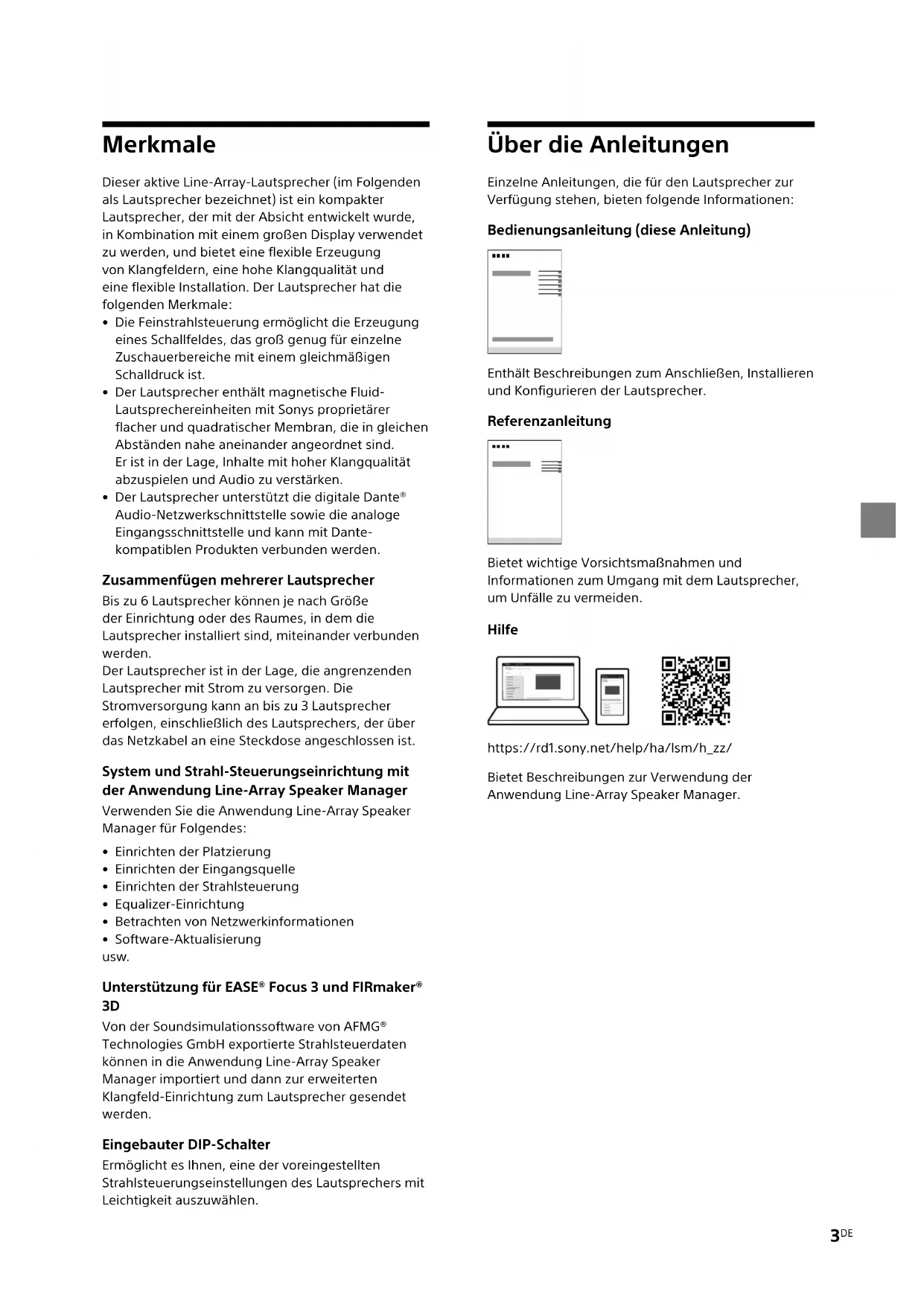 Von der Soundsimulationssoftware von AFMG® Technologies GmbH exportierte Strahlsteuerdaten können in die Anwendung Line-Array Speaker Manager importiert und dann zur erweiterten Klangfeld-Einrichtung zum Lautsprecher gesendet werden. Eingebauter DIP-Schalter Ermöglicht es Ihnen, eine der voreingestellten Strahlsteuerungseinstellungen des Lautsprechers mit Leichtigkeit auszuwählen. Über die Anleitungen Einzelne Anleitungen, die für den Lautsprecher zur Verfügung stehen, bieten folgende Informationen: Bedienungsanleitung (diese Anleitung) Enthält Beschreibungen zum Anschließen, Installieren und Konfigurieren der Lautsprecher. Referenzanleitung Bietet wichtige Vorsichtsmaßnahmen und Informationen zum Umgang mit dem Lautsprecher, um Unfälle zu vermeiden. Hilfe https://rd1.sony.net/help/ha/lsm/h_zz/ Bietet Beschreibungen zur Verwendung der Anwendung Line-Array Speaker Manager.4