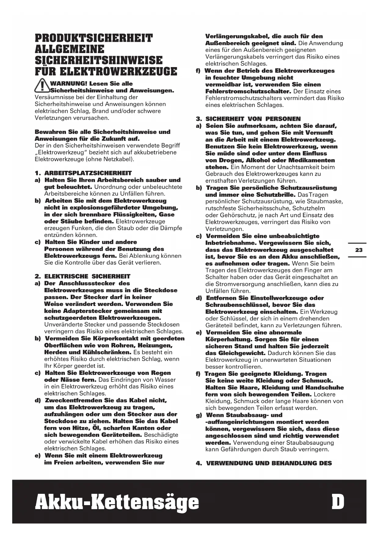 Akku-Kettensäge D ELEKTROWERKZEUGES a) Überlasten Sie das Gerät nicht. Verwenden Sie für Ihre Arbeit das dafür bestimmte Elektrowerkzeug. Mit dem passenden Elektrowerkzeug arbeiten Sie besser und sicherer im angegebenen Leistungsbereich. b) Benutzen Sie kein Elektrowerkzeug, dessen Schalter defekt ist. Ein Elektrowerkzeug, das sich nicht mehr ein- oder ausschalten lässt, ist gefährlich und muss repariert werden. c) Entfernen Sie den Akku, bevor Sie Geräteeinstellungen vornehmen, Zubehörteile wechseln oder das Gerät weglegen. Diese Vorsichtsmaßnahme verhindert den unbeabsichtigten Start des Elektrowerkzeuges. d) Bewahren Sie unbenutzte Elektrowerkzeuge außerhalb der Reichweite von Kindern auf. Lassen Sie Personen das Gerät nicht benutzen, die mit diesem nicht vertraut sind oder diese Anweisungen nicht gelesen haben. Elektrowerkzeuge sind gefährlich, wenn Sie von unerfahrenen Personen benutzt werden. e) Pflegen Sie Elektrowerkzeuge mit Sorgfalt. Kontrollieren Sie, ob bewegliche Teile einwandfrei funktionieren und nicht klemmen, ob Teile gebrochen oder so beschädigt sind, dass die Funktion des Elektrowerkzeuges beeinträchtigt ist. Lassen Sie beschädigte Teile vor dem Einsatz des Gerätes reparieren. Viele Unfälle haben ihre Ursache in schlecht gewarteten Elektrowerkzeugen. f) Halten Sie Schneidwerkzeuge scharf und sauber. Sorgfältig gepflegte Schneidwerkzeuge mit scharfen Schneidkanten verklemmen sich weniger und sind leichter zu führen. g) Verwenden Sie Elektrowerkzeug, Zubehör, Einsatzwerkzeuge usw. entsprechend diesen Anweisungen. Berücksichtigen Sie dabei die Arbeitsbedingungen und die auszuführende Tätigkeit. Der Gebrauch von Elektrowerkzeugen für andere als die vorgesehenen Anwendungen kann zu gefährlichen Situationen führen.