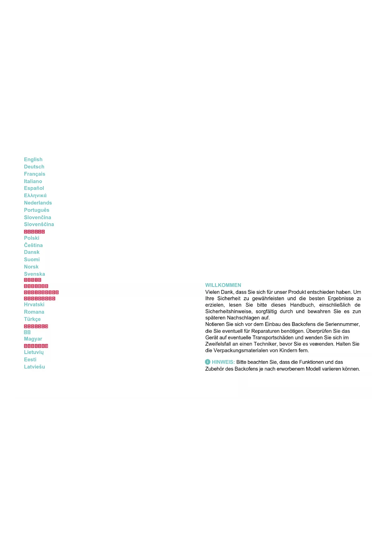 HINWEIS: Bitte beachten Sie, dass die Funktionen und das Zubehör des Backofens je nach erworbenem Modell variieren können.ZUSAMMENFASSUNG