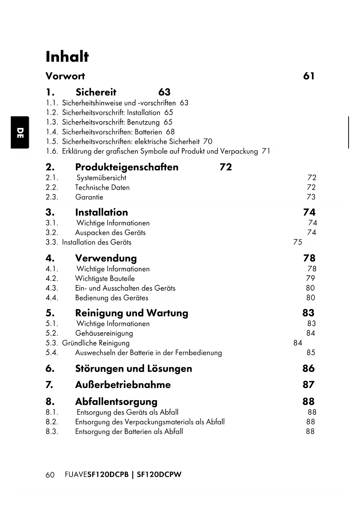 8.1. Entsorgung des Geräts als Abfall 88 8.2. Entsorgung des Verpackungsmaterials als Abfall 88 8.3. Entsorgung der Batterien als Abfall 88 Inhalt61