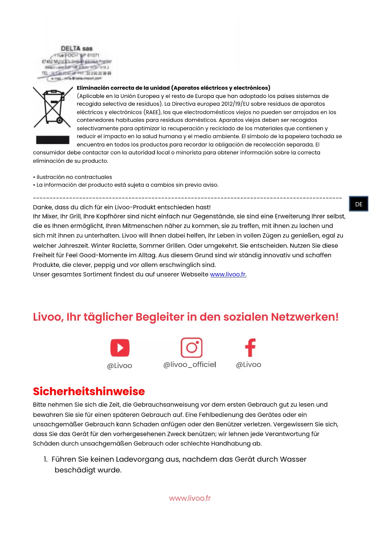 07)www.livoo.fr Korrekte Entsorgung des Geräts (Electrical and Electronic Equipment) (Gültig in der Europäischen Union und dem Rest Europas, dass die Länder einem separaten Sammelsystem eingeführt haben). Die europäische Richtlinie 2012/19/EU über Elektro-und Elektronik-Altgeräte (WEEE), in Verbindung bleiben Das alte elektrische Haushaltsgeräte dürfen nicht über den normalen Hausmüll entsorgt werden. Altgeräte müssen separat gesammelt werden, um die Wiederverwertung und das Recycling der beinhalteten Materialien zu optimieren und die Auswirkungen auf die menschliche Gesundheit und die Umwelt. Das Symbol der durchgestrichenen Mülltonne auf alle Produkte gekennzeichnet, die aus der getrennten Sammlung zu erinnern. Die Verbraucher sollten ihre Kontaktdaten lokalen Behörden oder Ihren Händler für Informationen über die korrekte Entsorgung ihrer Produkte.