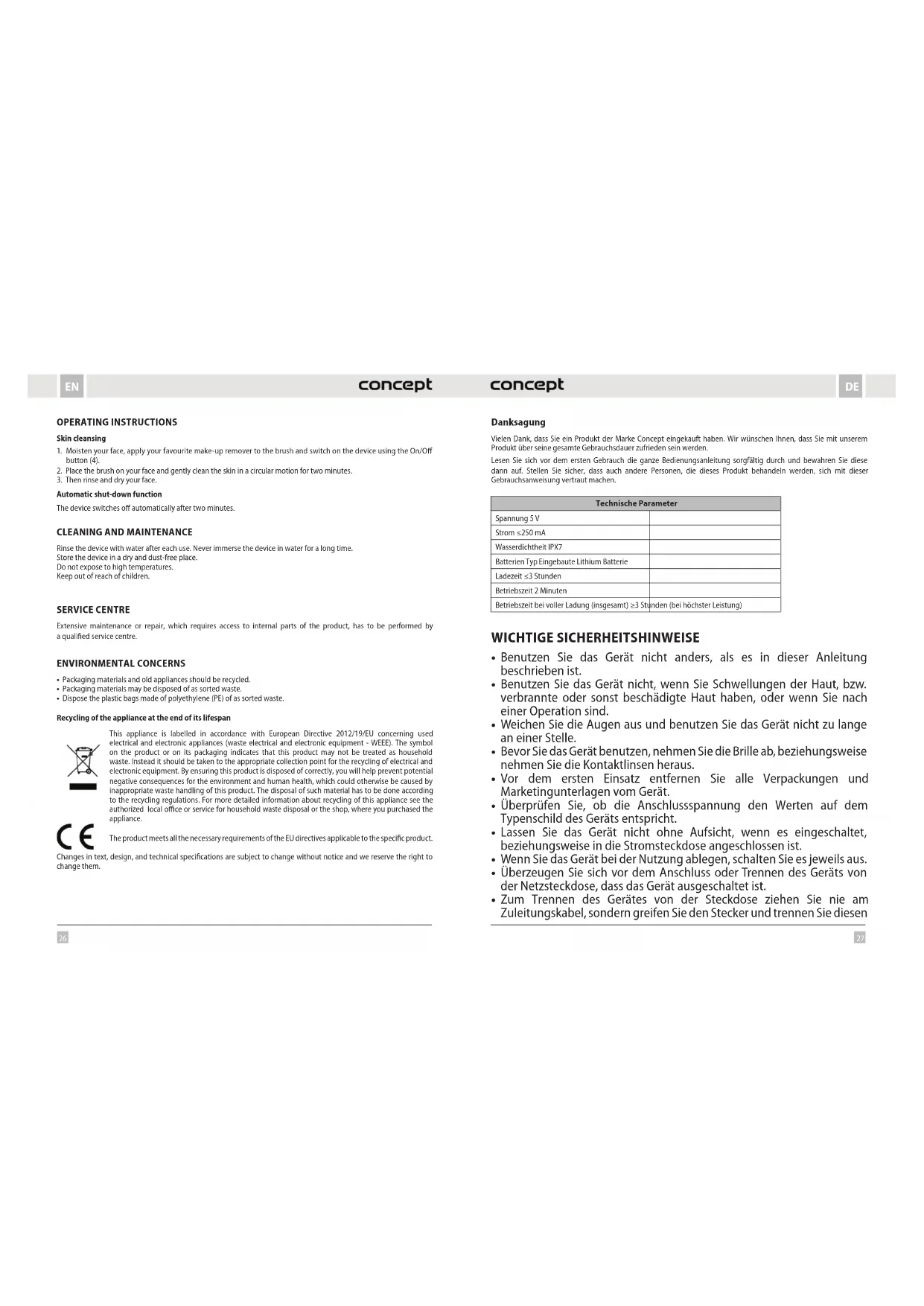 - Die Polyäthylentüten (PE) geben Sie zur Sammlung des Materials zum Recyceln ab. Recycling des Gerätes am Ende seiner Lebensdauer Dieses Gerät ist im Einklang mit der Europäischen Richtlinie 2012/19/EU über Elektro- und Elektronik- Altgeräte (WEEE) gekennzeichnet. Das Symbol am Produkt oder an dessen Verpackung gibt an, dass dieses Produkt nicht in den Haushaltsabfall gehört. Es ist auf eine Sammelstelle zum Recyceln der elektrischen und elektronischen Anlagen zu bringen. Durch die Sicherstellung der korrekten Entsorgung dieses Produktes helfen Sie, negative Konsequenzen für die Umwelt und die Gesundheit der Menschen zu verhindern, die durch die unsachgemäße Entsorgung dieses Produktes verursacht würden. Die Entsorgung muss im Einklang mit den Vorschriften für die Abfallbehandlung durchgeführt werden. Ausführlichere Informationen zum Recycling dieses Produkts erhalten Sie bei der zuständigen örtlichen Behörde, dem Dienstleister für Entsorgung von Haushaltsabfall oder in dem Geschäft, wo Sie das Produkt gekauft haben. Dieses Produkt erfüllt sämtliche Grundanforderungen der EU-Richtlinien, die sich darauf beziehen. Die Änderungen im Text, im Design und in den technischen Spezifizierungen können ohne vorherigen Hinweis geändert werden, und wir behalten uns das Recht auf deren Änderungen vor.32 33 FRFR MERCI Nous vous remercions d’avoir acheté le produit de la marque Concept et nous espérons qu’il vous apportera votre entière satisfaction pendant son utilisation. Lire attentivement le manuel d’emploi avant la première utilisation et le conserver. Faire prendre connaissance du manuel d’emploi par les autres personnes pouvant manipuler le produit. Caractéristiques techniques Tension 5 V Courant ≤250 mA Etanchéité IPX7 Type batterie batterie au lithium intégrée Durée de chargement ≤3 heures Durée de fonctionnement 2 min Autonomie à pleine charge (total) ≥3 heures (à puissance maximale) PRÉCAUTIONS PARTICULIÈRES DE SÉCURITÉ
