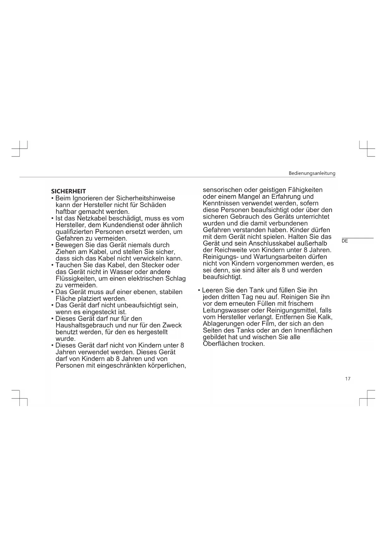 - Dieses Gerät darf nicht von Kindern unter 8 Jahren verwendet werden. Dieses Gerät darf von Kindern ab 8 Jahren und von Personen mit eingeschränkten körperlichen, sensorischen oder geistigen Fähigkeiten oder einem Mangel an Erfahrung und Kenntnissen verwendet werden, sofern diese Personen beaufsichtigt oder über den sicheren Gebrauch des Geräts unterrichtet wurden und die damit verbundenen Gefahren verstanden haben. Kinder dürfen mit dem Gerät nicht spielen. Halten Sie das Gerät und sein Anschlusskabel außerhalb der Reichweite von Kindern unter 8 Jahren. Reinigungs- und Wartungsarbeiten dürfen nicht von Kindern vorgenommen werden, es sei denn, sie sind älter als 8 und werden beaufsichtigt.